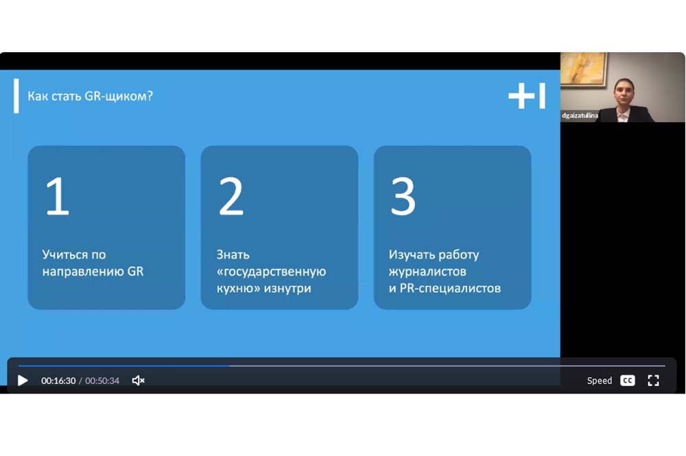Следующим приглашённым спикером программы Бизнес-акселератора с темой «GR-инструмент (формат взаимодействия с государственной властью) для продвижения проектов (продуктов) компаний и стартапов» стала заместитель гендиректора по взаимодействию с органами государственной власти компании Т1 (ГК «Иннотех») Дина Гайзатуллина. Спикер отметила, что с 2020 года государство компенсирует половину частных инвестиций в технологические стартапы российских университетов – проекты, которые базируются на разработках студентов и преподавателей, – чтобы стимулировать развитие технологического предпринимательства в вузах.