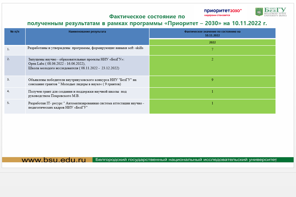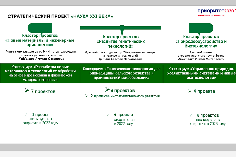 На заседании совета коснулись промежуточных результатов и успехов в реализации ряда проектов, а также перспектив на предстоящий год. Как отметил проректор по науке и инновациям Белгородского госуниверситета, руководитель платформы «Наука XXI века» Николай Репников, в стратегический проект «Наука XXI века» входит три кластера, по которым реализуется порядка 20 проектов, открытие ещё восьми запланировано в 2023 году.
