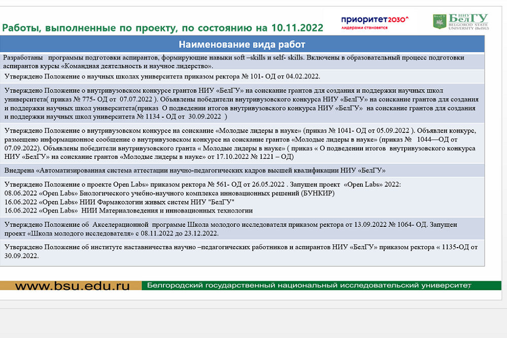 Николай Иванович рассказал о курируемом проекте «Трансформация исследовательской экосистемы подготовки кадров высшей квалификации в НИУ «БелГУ». Его целью является создание к декабрю 2023 года не менее девяти научных школ и исследовательских команд нового типа в соответствии с перспективами развития ключевых секторов экономики региона, которые должны реализовать полный процессный цикл – от исследования, разработки, проектирования и прототипирования до производства и коммерциализации.