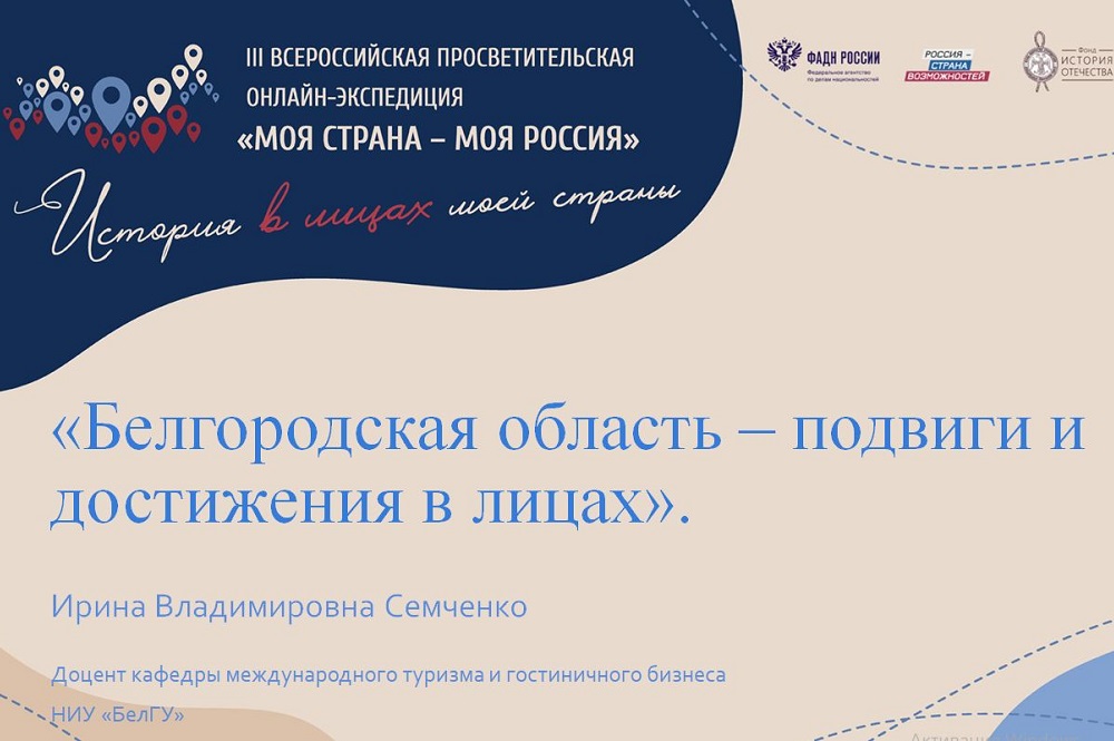 Доцент кафедры международного туризма и гостиничного бизнеса Института экономики и управления НИУ «БелГУ» Ирина Семченко стала победителем III Всероссийской просветительской онлайн-экспедиции «Моя страна – моя Россия» в номинации «История в лицах моей страны». Участница читала лекцию «Белгородская область – подвиги и достижения в лицах».
