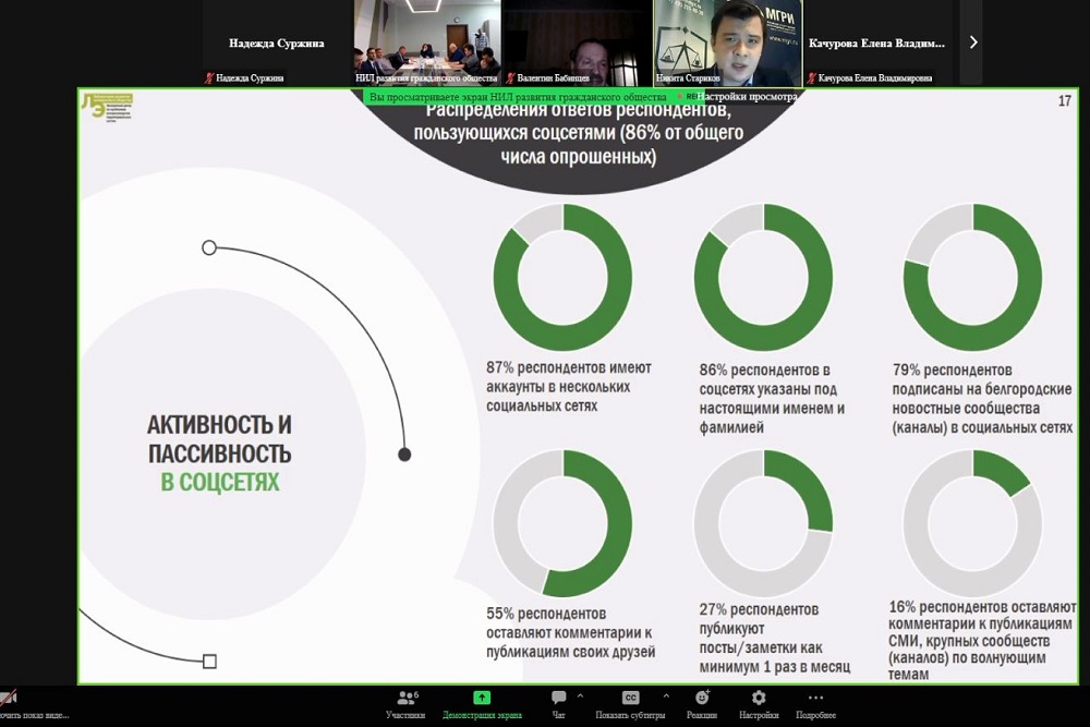 На рабочем совещании-отчёте о ходе работ по проекту в рамках программы «Приоритет-2030» «Создание экспертного центра по проблемам воспроизводства территориальных систем» обсудили итоги работы НИЛ развития гражданского общества в текущем году и исследование комплексного мониторинга консолидации общества в регионе. С докладами выступили руководитель научно-исследовательской лаборатории Александр Гармашев, старший научный сотрудник НИЛ Никита Стариков и заместитель директора института экономики и управления по научной работе Яна Серкина.