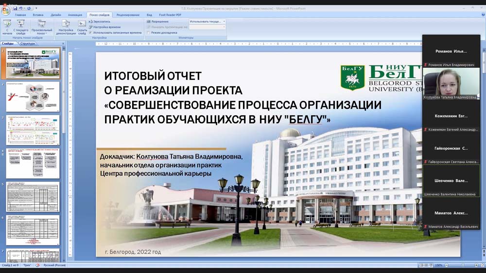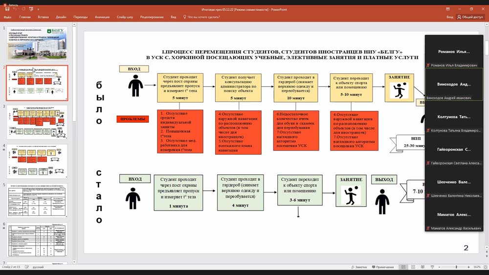В числе представленных к закрытию ещё два проекта развития – «Создание видеотеки по формированию практических навыков для подготовки выпускников медицинского института и ИДМиФО к первичной и первичной специализированной аккредитации» и «Создание и запуск научно-исследовательской лаборатории мультимодальных исследований», а также два «бережливых» проекта – «Совершенствование процесса организации практик обучающихся в НИУ "БелГУ"» и «Совершенствование логистики и процесса перемещения клиентов на территории УСК С. Хоркиной».