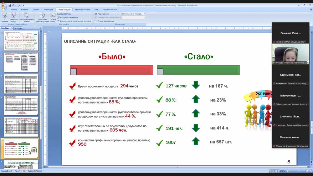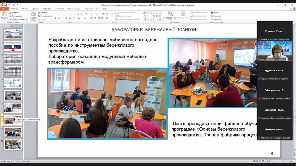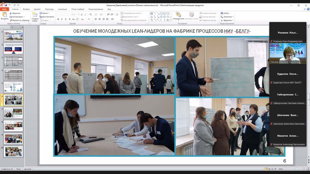 О закрытии проекта развития «Создание практико-ориентированной образовательной площадки "Бережливый полигон"» доложила доцент кафедры менеджмента Старооскольского филиала НИУ «БелГУ» Татьяна Шнуренко. Она отметила, что в результате реализации проекта 30 студентов СОФ НИУ «БелГУ» и 28 студентов средних профессиональных учебных заведений приобрели компетенции молодёжного lean-лидера в системе дополнительного образования, а ещё 50 обучающихся общеобразовательных школ освоили бережливые компетенции в системе командно-тренинговой работы с молодёжными lean-лидерами.