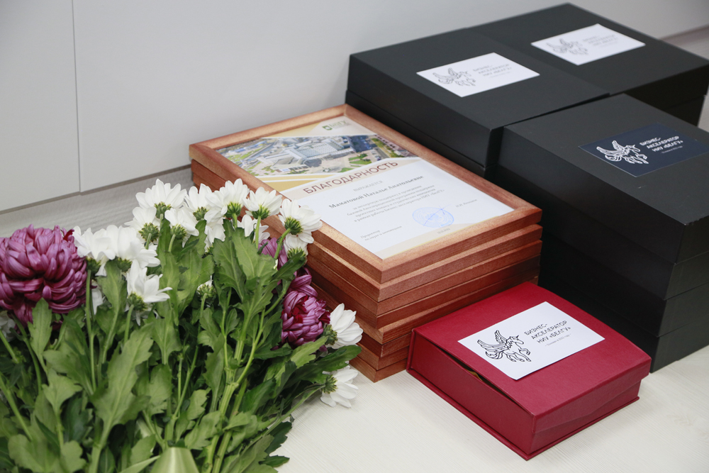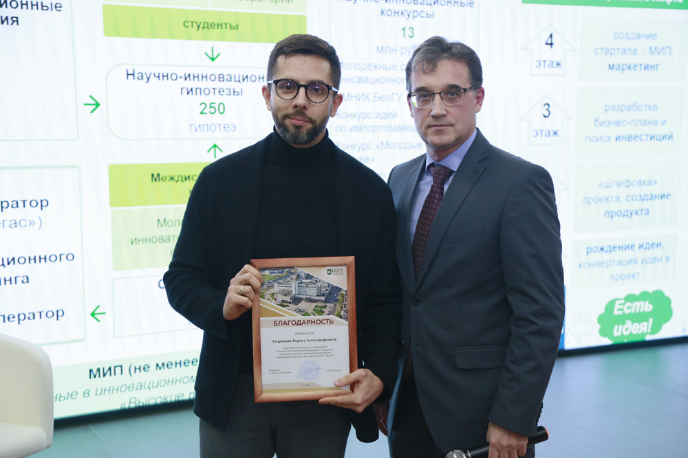 Андрей Пересыпкин выразил признательность экспертам за поддержку акселерационной программы и от имени проректора по науке и инновациям НИУ «БелГУ» Николая Репникова вручил благодарности руководителю проектного офиса НИУ «БелГУ» Светлане Гайворонской, доктору экономических наук, заведующему кафедрой менеджмента и маркетинга института экономики и управления НИУ «БелГУ» Борису Тхорикову, доцентам кафедры менеджмента и маркетинга ИЭиУ НИУ «БелГУ», кандидатам экономических наук Наталье Маматовой, Ольге Герасименко и Марии Луговской, директору Регионального центра интеллектуальной собственности, к.т.н. Дмитрию Ушакову.
