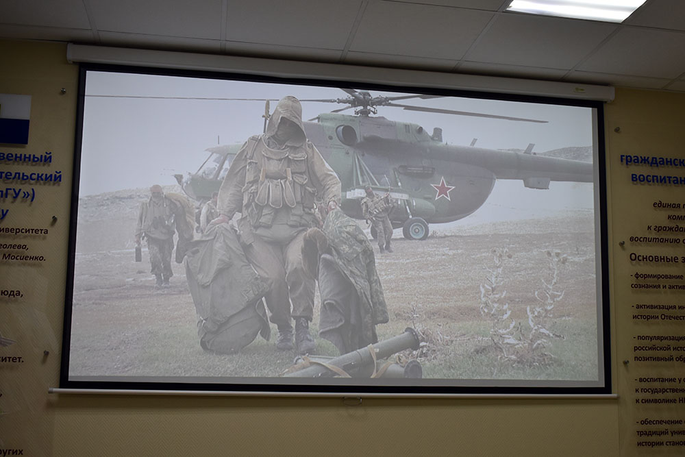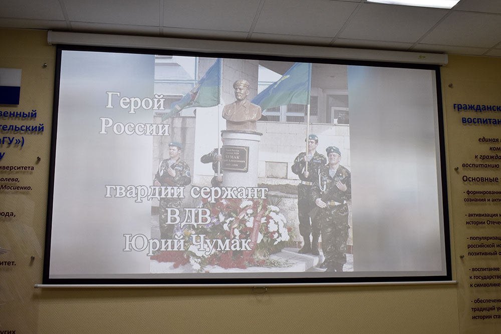 На площадке Центра гражданско-патриотического воспитания обучающихся НИУ «БелГУ» состоялась встреча с автором песен о Героях России – Героях Белгородчины Сергеем Бобрышевым. Сергей Николаевич представил гостям сценарий театральных постановок о Героях России, повествующих о жизни, судьбах выдающихся героических людей, их близких и родных. Перед участниками мероприятия предстали образы главных героев авторских рассказов – гвардии старшого сержанта Дениса Сергеевича Зуева, учившегося в НИУ «БелГУ» на биолого-химическом факультете; полковника Владимира Васильевича Бурцева – выпускника педагогического института; Юрия Алексеевича Чумака, Юрия Васильевича Ворновского, Александра Михайловича Ананичева. После каждого сценарного рассказа участникам были показаны музыкальные видеоролики о героях, написанные на слова Сергея Бобрышева.