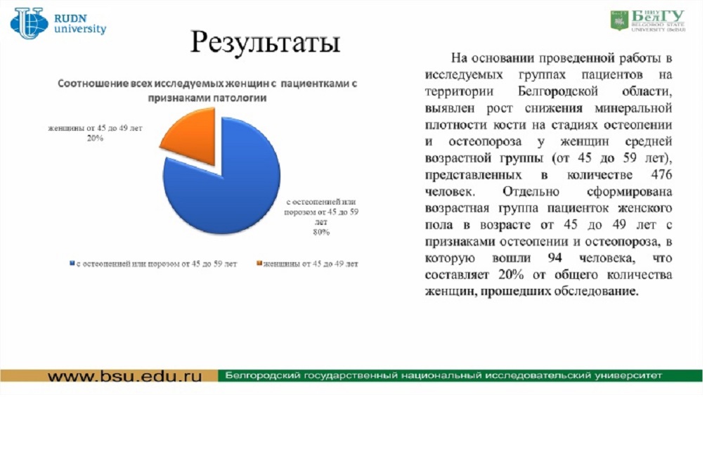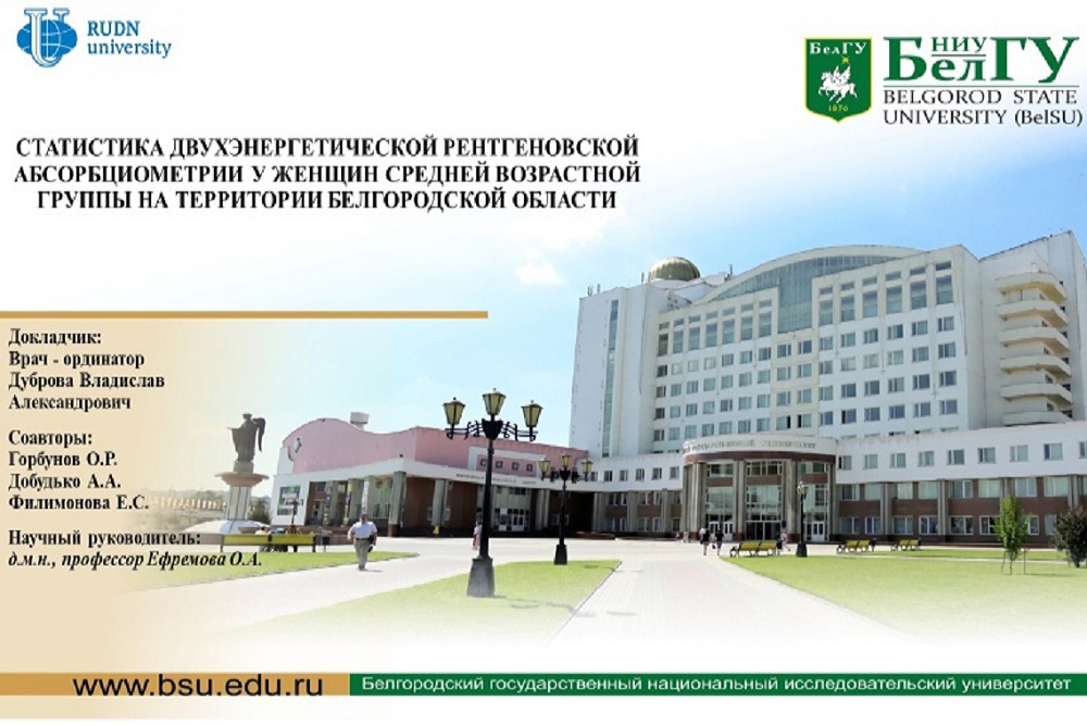 Будущие медики предоставили тезисы на тему «Статистика двухэнергетической рентгеновской абсорбциометрии у женщин средней возрастной группы на территории Белгородской области». С докладом выступил аспирант кафедры факультетской терапии, ординатор 1-го года Владислав Дуброва. Соавторами стали студенты направления «Лечебное дело» Олег Горбунов, Елизавета Филимонова и Анастасия Добудько.