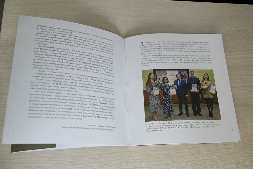 Альбом живописи художников Юлия Феддерса и Александра Крылова «Два академика. Белгород и его окрестности» стал завершающим этапом уникального выставочного проекта «Два академика», организатором которого выступил музей истории НИУ «БелГУ». Выставку реализовали совместно с Государственным историко-архитектурным и природным музеем-заповедником «Изборск» в рамках проекта «Историческое наследие НИУ «БелГУ» программы «Приоритет-2030».