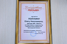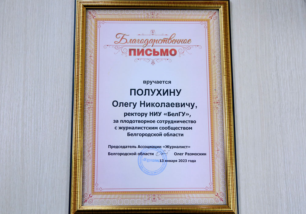Ассоциация городских и районных газет Белгородской области «Журналист» отметила плодотворное сотрудничество университета и журналистского сообщества, выразив письменную благодарность в адрес главы вуза.