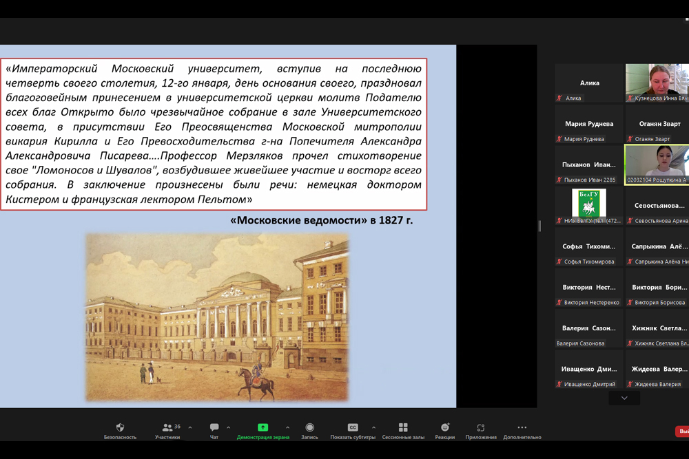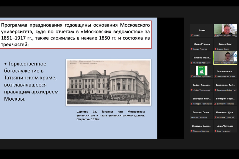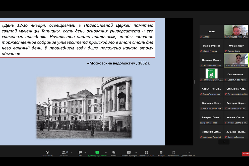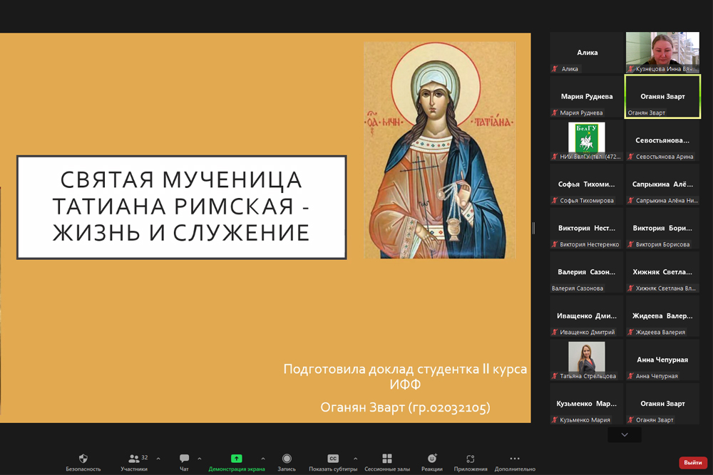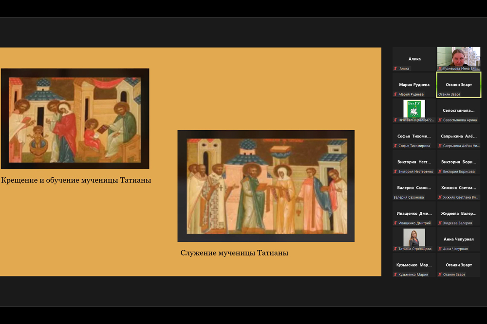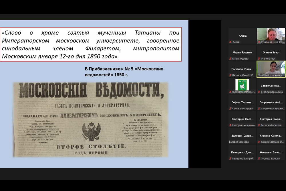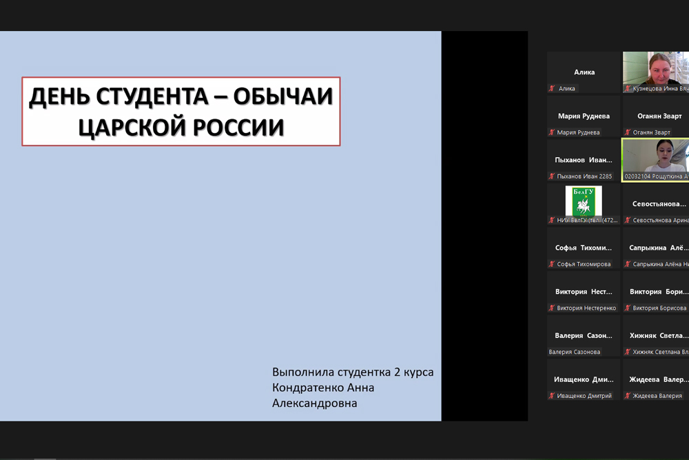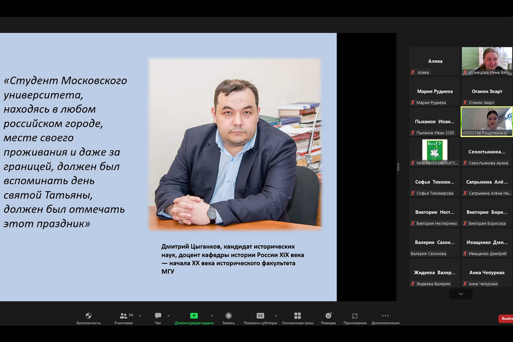 Студентка историко-филологического факультета педагогического института Зварт Оганян представила доклад на тему «Святая мученица Татиана Римская – жизнь и служение» (науч. рук. д.и.н., проф., кафедры всеобщей истории Николай Болгов), Анна Рощупкина осветила тему «День студента – обычаи царской России» (науч. рук. Мария Руднева), а активистка патриотического Центра, студентка института инженерных и цифровых технологий Алика Бацман – «Татьянин день – история профессионального праздника студентов» (науч. рук. Инна Кузнецова).