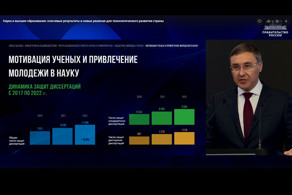 – Общее количество защит только за 2022 год выросло почти на 20%, а с 2020 года рост ещё более существенный: кандидатских диссертаций – с 6,5 тысяч в 2020 году до 8,5 тысяч в 2022; докторских диссертаций – с чуть менее тысячи до полутора тысяч в 2022 году. Это говорит не только о возросшем качестве исследований, но и показывает рост количества людей, которые решили связать свою жизнь с наукой, — подчеркнул министр.