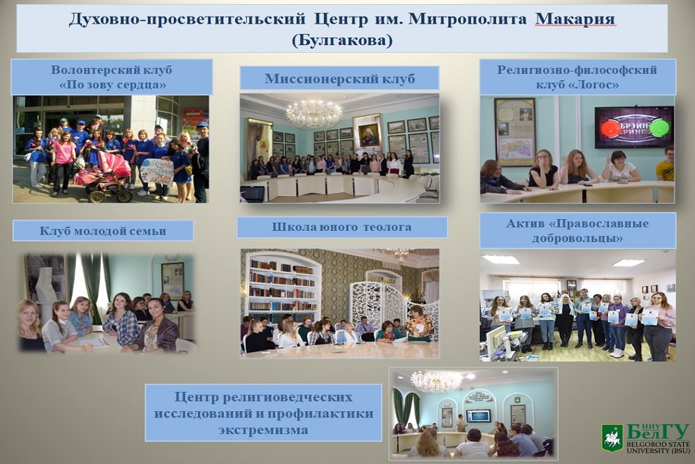 Также на заседании обсудили вопрос взаимодействия Духовно-просветительского центра им. митрополита Московского и Коломенского Макария (Булгакова) с Белгородской митрополией. Доклад представила заведующая кафедрой философии и теологии, профессор Тамара Липич. Спикер отметила, что в НИУ «БелГУ» ведётся активная работа с молодёжью, действует актив «Православные добровольцы» и Центр религиоведческих исследований и профилактики экстремизма. Деятельность направлена на развитие духовных ценностей у молодого поколения и повышение уровня престижа теологического образования.