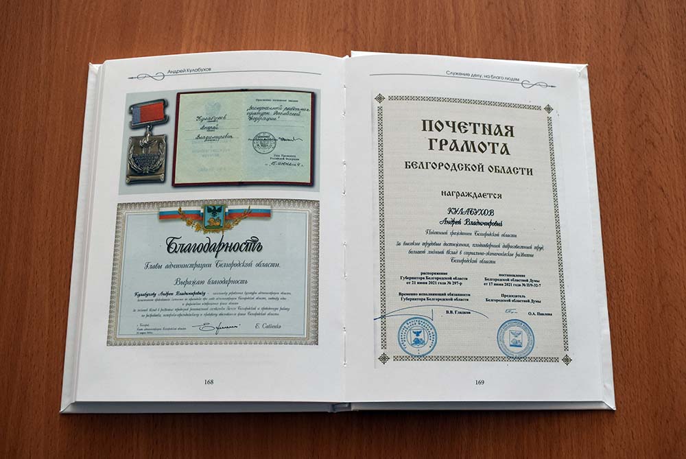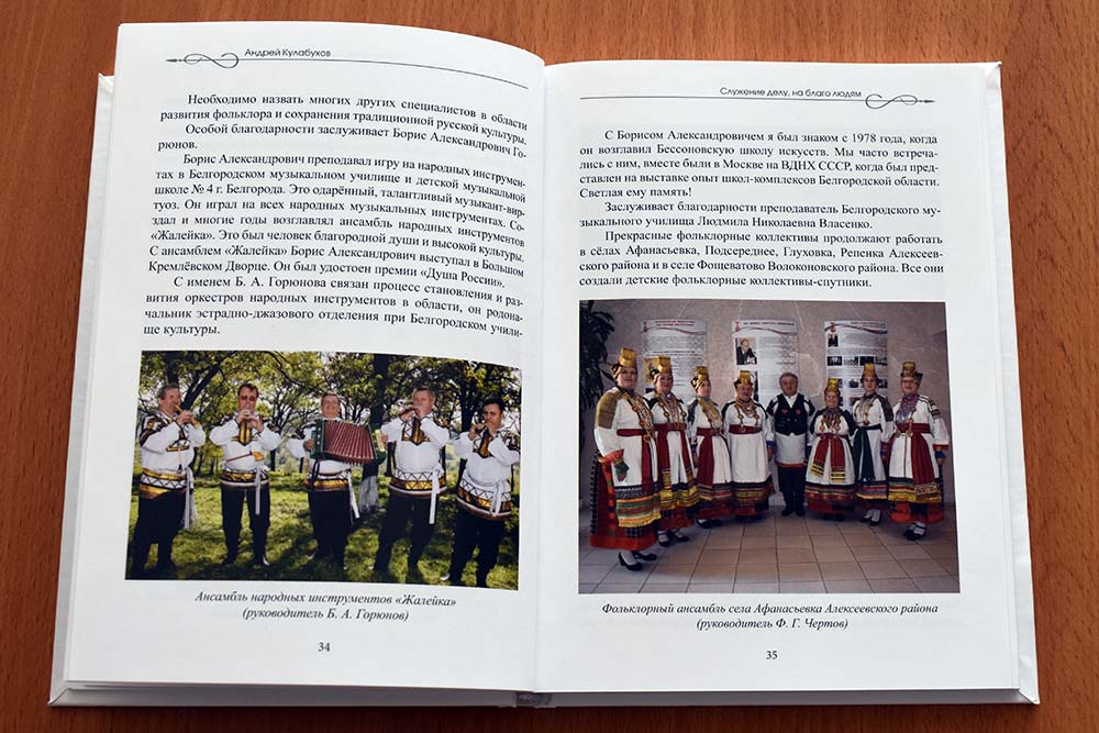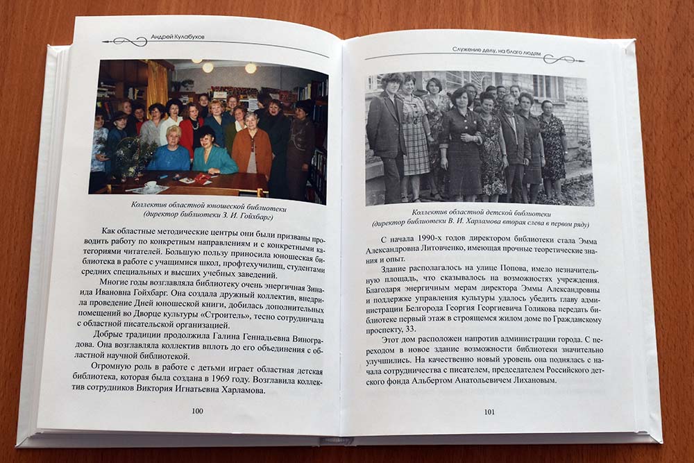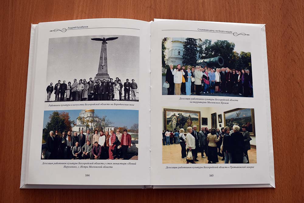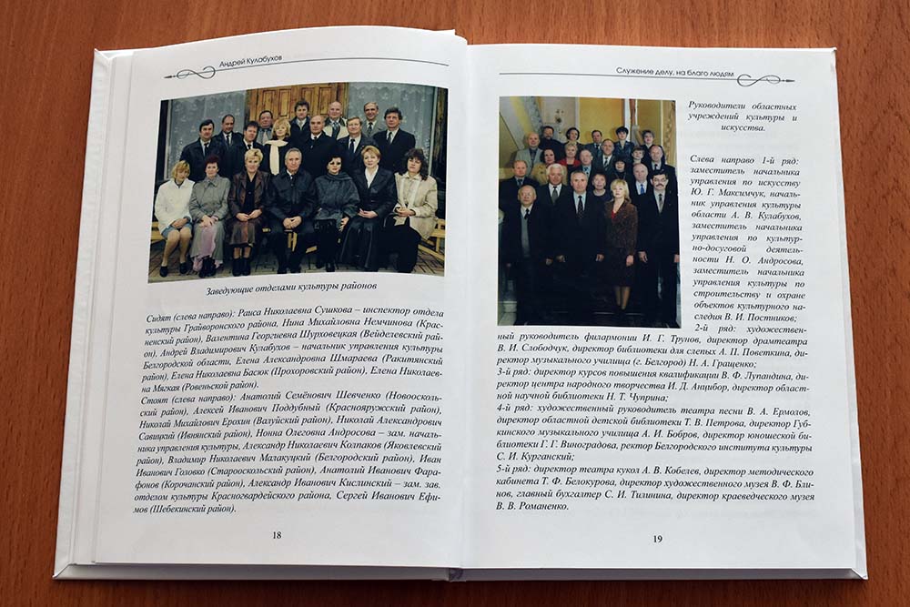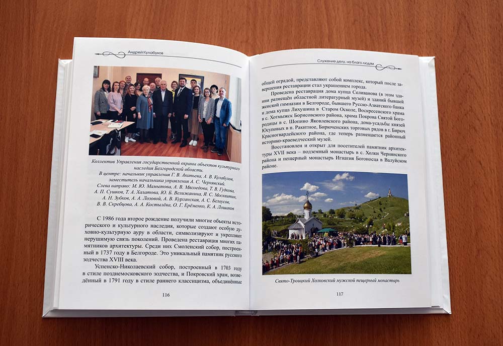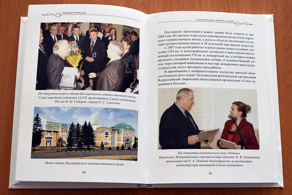 Книга «Служение делу, на благо людям: как развивались культура и искусство Белгородской области в 1985-2008 годах» была издана в 2022 году к 80-летию нашего земляка, заслуженного работника культуры РФ, почётного гражданина Белгородской области Андрея Кулабухова. Именно в тот период Андрей Владимирович возглавлял региональное управление культуры.