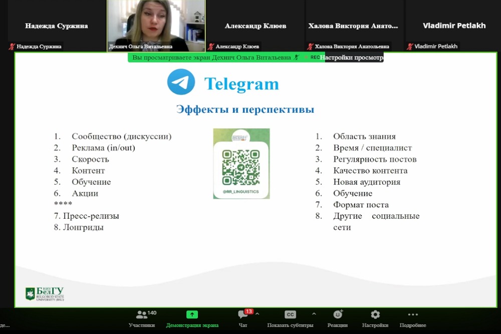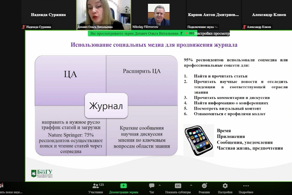 Организаторами вебинара «Продвижение журнала в социальных медиа: Telegram» для редакторских коллектив и издательств и из всех регионов страны выступили Белгородский госуниверситет и Ассоциация научных редакторов и издателей (АНРИ). Модератор встречи – президент Ассоциации научных редакторов и издателей (АНРИ), главный редактор журнала «Научный редактор и издатель» Ольга Кириллова – подчеркнула значимость и актуальность темы в условиях смещения научного и делового общения на площадки социальных медиа.