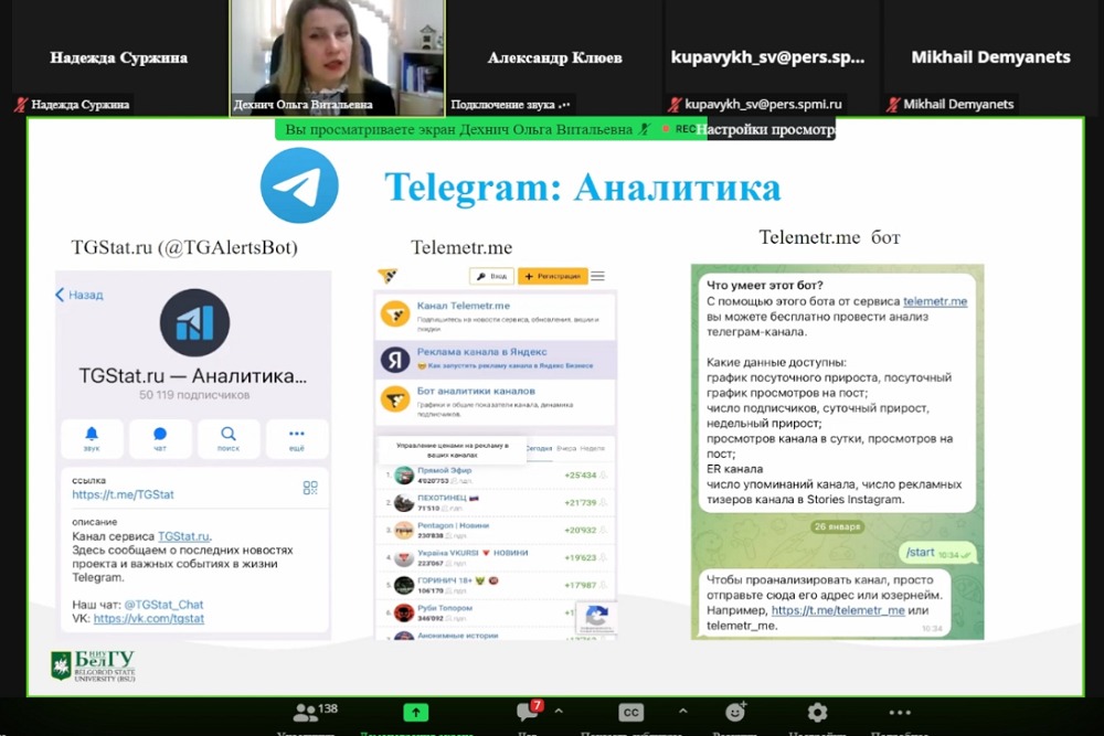Слушатели вебинара узнали, как создать канал с нуля, с какой периодичностью размещать посты и как правильно оформлять их, чтобы информация была интересна читателю. Также спикер поделилась доступными инструментами для анализа аудитории: бот подсчитывает количество лайков, подписок и отписок, создаёт опросы, оформляет посты. В платных функциях можно заказать детальный разбор аудитории по таким маркерам, как пол, страна проживания, возраст.
