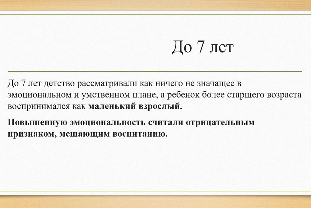 Интересным с позиции современности является и тот факт, что до семи лет ребёнок считался неразумным младенцем, и в этот период никто не занимался его обучением. А после семи лет он «входил в разум», мог отличать плохие поступки от хороших и был способен к обучению. Примечательно, что с семи лет детям разрешалось чтение любых книг: не было никаких преград для получения любой информации.