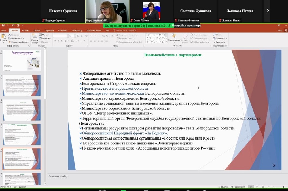 Центр имеет налаженные связи со значительным количеством партнёров – Министерством по делам молодёжи Белгородской области, региональным ресурсным центром развития добровольчества в Белгородской области, Общероссийским Народным фронтом «За Родину!», некоммерческой организацией «Ассоциация волонтерских центров России», – что позволяет эффективно вести волонтёрскую деятельность на территории всего региона. С начала года в университете работает Добро.ЦЕНТР – совместный проект НИУ «БелГУ» и Ассоциации волонтёрских центров России.