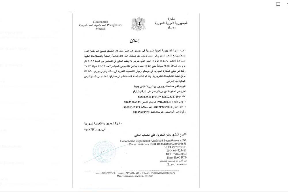 Посольство САР в РФ открыло сбор средств для помощи пострадавшим от землетрясения. Принять участие в акции поддержки и перевести любую сумму на счёт может каждый.