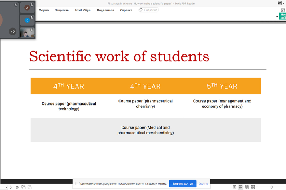 На семинаре «Первые шаги в науке. Методология подготовки научных работ» (First steps in science: How to make a scientific paper?) доцент кафедры фармацевтической технологии Дарья Фадеева ознакомила обучающихся с направлениями и этапами организации научной работы и рассказала о перспективах участия в конференциях различного уровня.