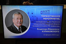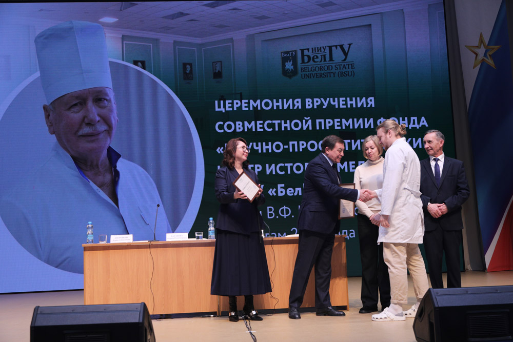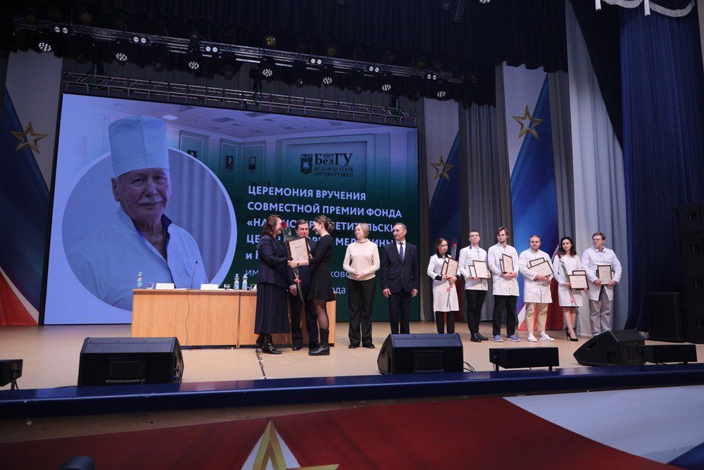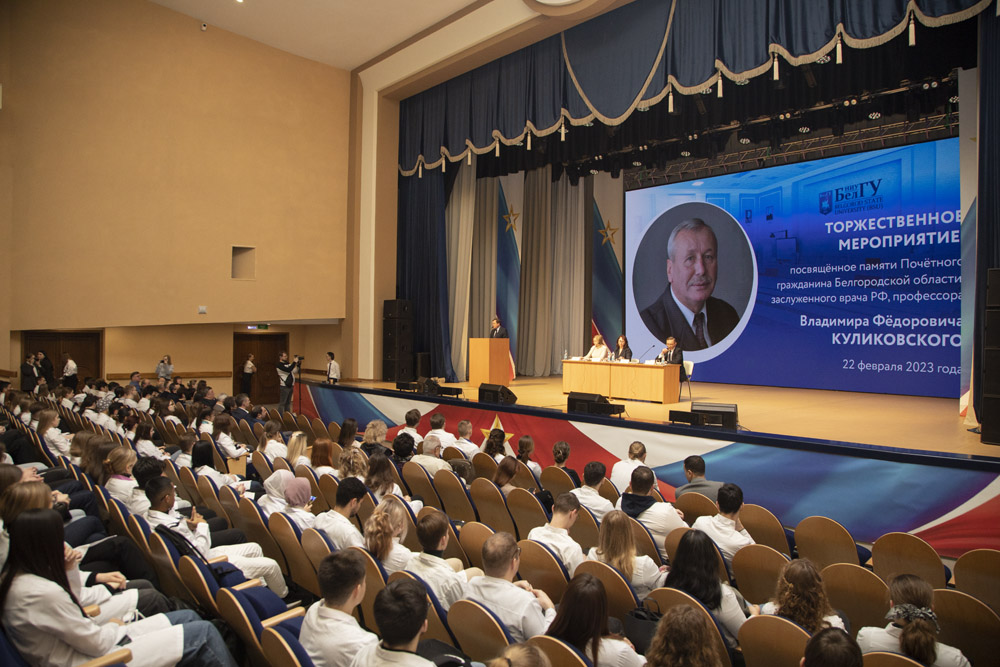 В Белгородском государственном университете состоялась церемония вручения сертификатов на получение премии и дипломов лауреатов премии имени В.Ф. Куликовского. Первая совместная премия Фонда «Научно-просветительский центр истории медицины» и НИУ «БелГУ» имени В.Ф. Куликовского присуждена девяти студентам старших курсов и молодым учёным, преподавателям медицинского института. На памятном мероприятии, которое прошло в канун дня рождения выдающегося хирурга, первого директора медицинского института НИУ «БелГУ» Владимира Фёдоровича Куликовского (23 февраля ему бы исполнилось 73 года) присутствовали ректор вуза Олег Полухин, директор мединститута Николай Белоусов, министр здравоохранения Белгородской области Андрей Иконников, заместитель министра здравоохранения Елена Андронова, главный врач Белгородской областной клинической больницы Святителя Иоасафа Жанна Чефранова, председатель правления Фонда развития медицинской науки и образования «Научно-просветительский центр истории медицины» Марина Баранова – дочь Владимира Куликовского, студенты, аспиранты и преподаватели медицинского института, коллеги, друзья Владимира Фёдоровича из родного ему Борисовского района. Мероприятие началось с минуты молчания, которую объявил директор мединститута Николай Белоусов.