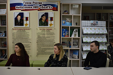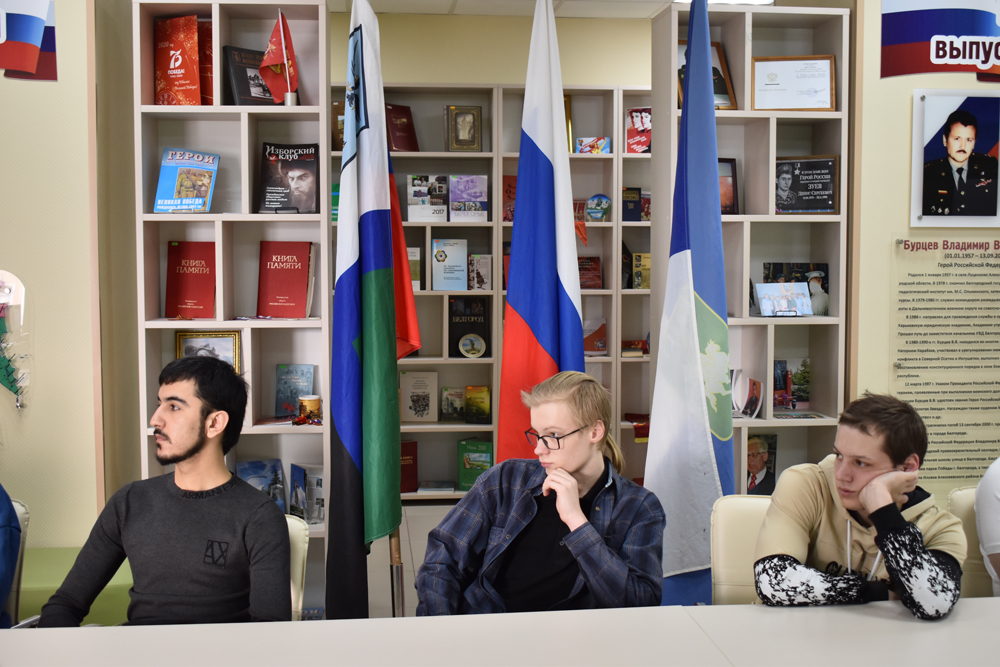 Встреча прошла под эгидой Центра гражданско-патриотического воспитания обучающихся совместно с Центром общественно-политического просвещения. Аспирант педагогического института Никита подключился дистанционно. Боец Вооружённых сил России в тёмно-зелёной балаклаве и солнцезащитных очках рассказал о своей жизни и учёбе в НИУ «БелГУ».
