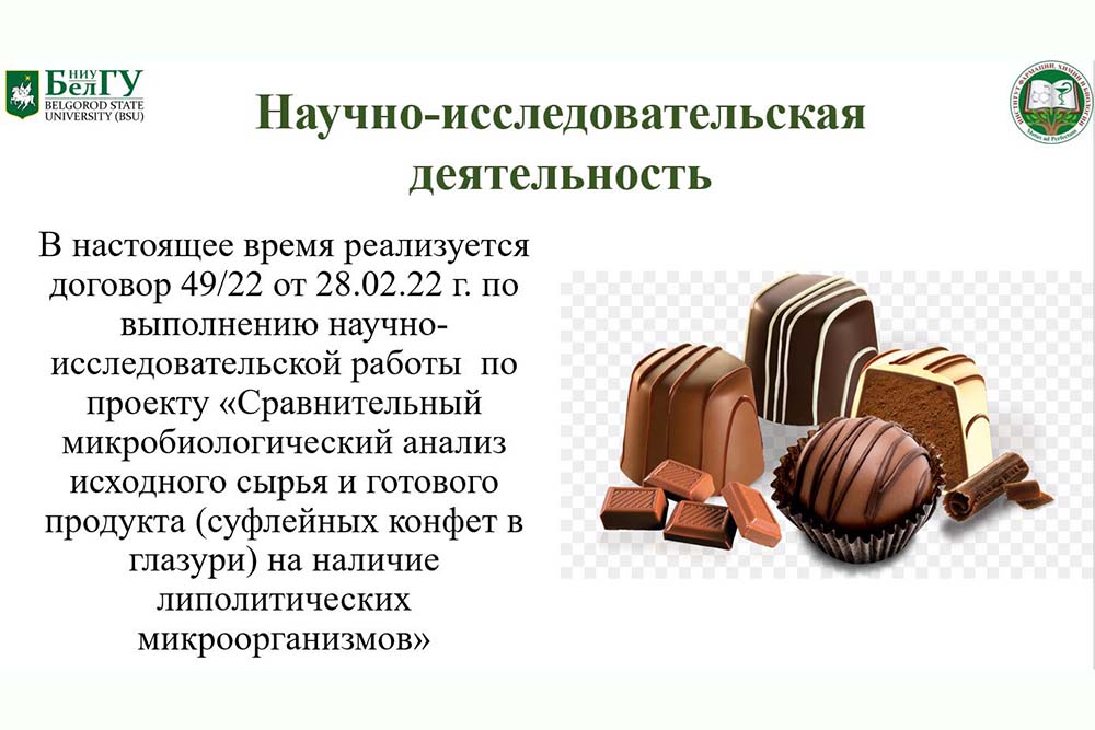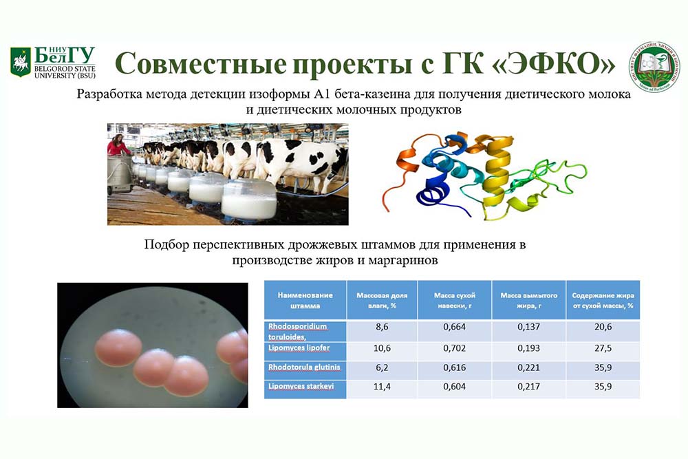 Совместные проекты реализуются и с предприятиями-партнёрами, одним из которых является АО «ЭФКО». Как отметила содокладчик, начальник лаборатории микробиологии АО «ЭФКО» Ольга Бережкова, в их числе разработка метода детекции изоформы А1 бета-казеина для получения диетического молока и молочных продуктов, подбор перспективных дрожжевых штаммов для применения в производстве жиров и маргаринов, а также сравнительный микробиологический анализ исходного сырья и готового продукта (суфлейных конфет в глазури) на наличие липолитических микроорганизмов.