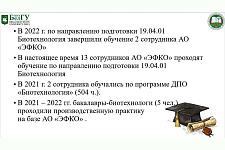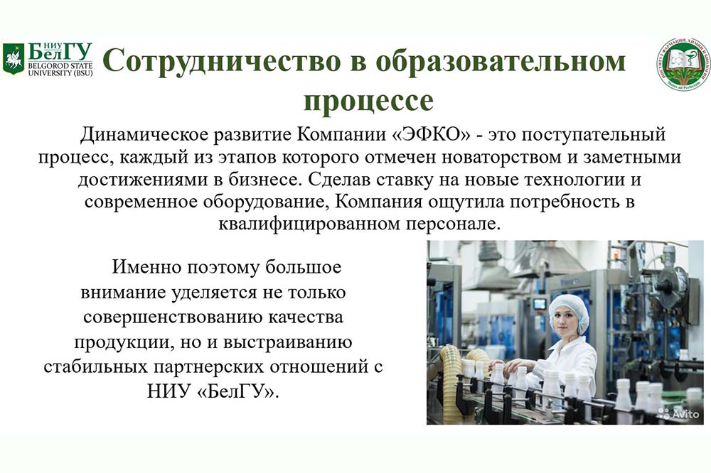 Представитель компании «ЭФКО» также поблагодарила НИУ «БелГУ» за сотрудничество в сфере подготовки кадров, отметив, что в институте фармации, химии и биологии в 2022 году обучение по направлению «Биотехнология» завершили двое сотрудников компании, ещё 13 продолжают учёбу. В свою очередь предприятия группы компаний являются базами практик для студентов ИФХиБ.
