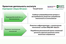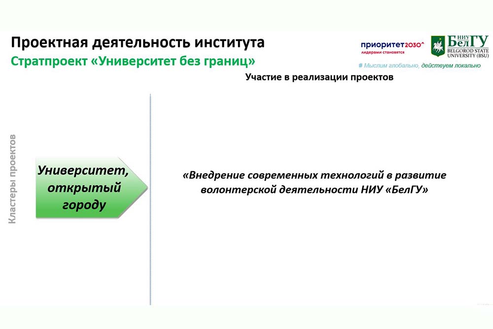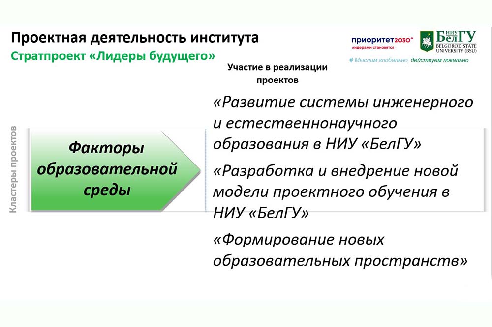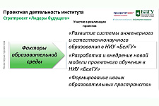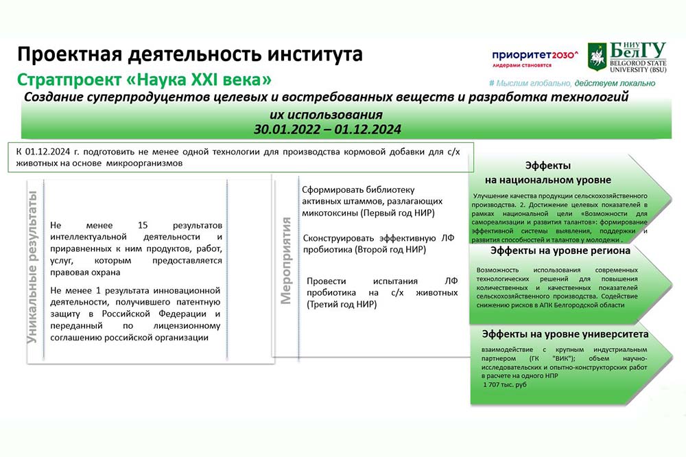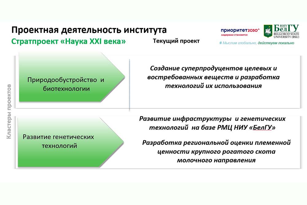 Институт участвует в реализации семи проектов программы «Приоритет-2030», три из них – «Создание суперпродуцентов целевых и востребованных веществ и разработка технологий их использования», «Развитие инфраструктуры и генетических технологий на базе регионального микробиологического центра НИУ «БелГУ» и «Разработка региональной оценки племенной ценности крупного рогатого скота молочного направления» – на платформе «Наука XXI века».