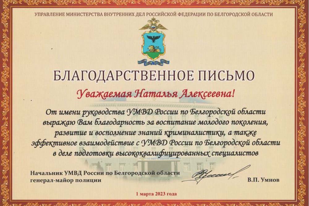 В профессиональный праздник от имени начальника УМВД России по Белгородской области, генерал-майора полиции Василия Умнова заведующую кафедрой экспертизы и криминалистики Наталью Жукову поздравил начальник следственного управления, полковник юстиции Юрий Баранов, выразив благодарность за воспитание молодого поколения, подготовку высококвалифицированных специалистов, развитие и восполнение знаний криминалистики.