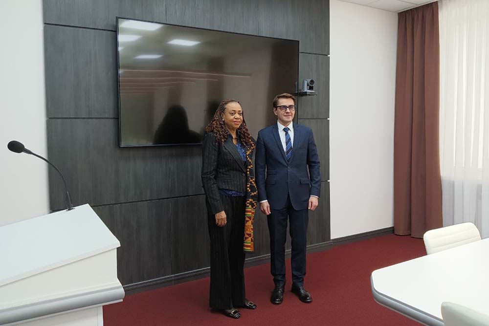 Проректор по международному сотрудничеству Владислав Кучмистый и представители департамента международного сотрудничества НИУ «БелГУ» встретились с Чрезвычайным и Полномочным Послом Республики Гана в Российской Федерации госпожой Лесли Акуа Акяа Опоку-Варе, заместителем Посла Республики Гана в Российской Федерации Гербертом Эдди-Нетти, главой Канцелярии Абиэль Ашитей Арма, первым секретарём, главой консульского отдела и отдела образования Леонардом Амартей Телфер, первым секретарём (протокол) Джейкоб Квао Архин.
