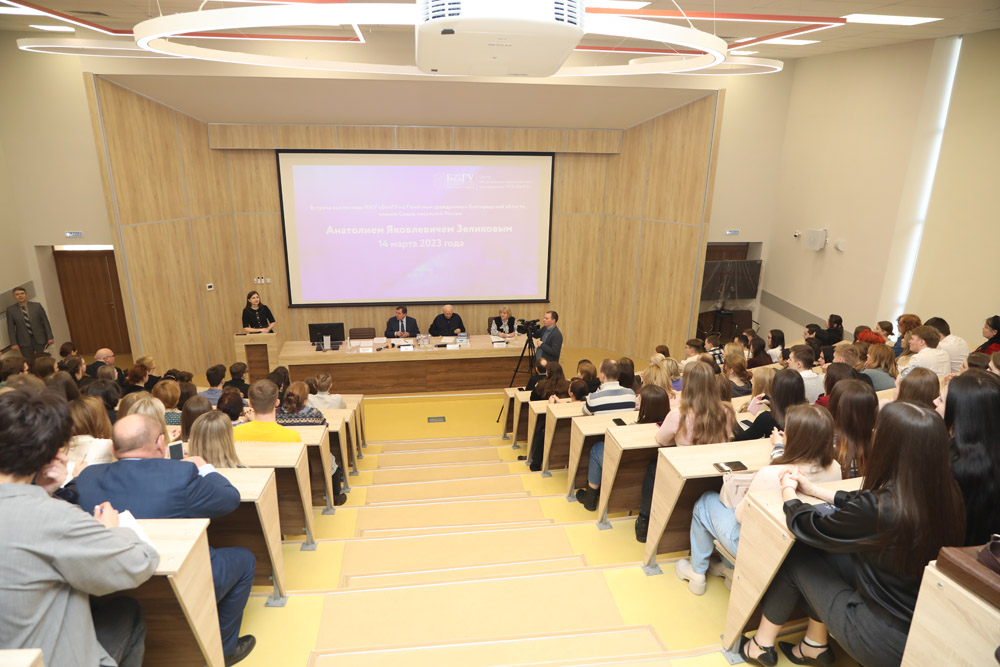 Гостя университета, председателя Белгородской областной Думы второго-четвертого созывов, Почётного гражданина Белгородской области, члена Союза писателей России, автора книг Анатолия Яковлевича Зеликова представила проректор по воспитательной деятельности и молодёжной политике НИУ «БелГУ» Елена Цуканова, отметившая, что с началом СВО острее встал вопрос патриотической работы с молодёжью.
