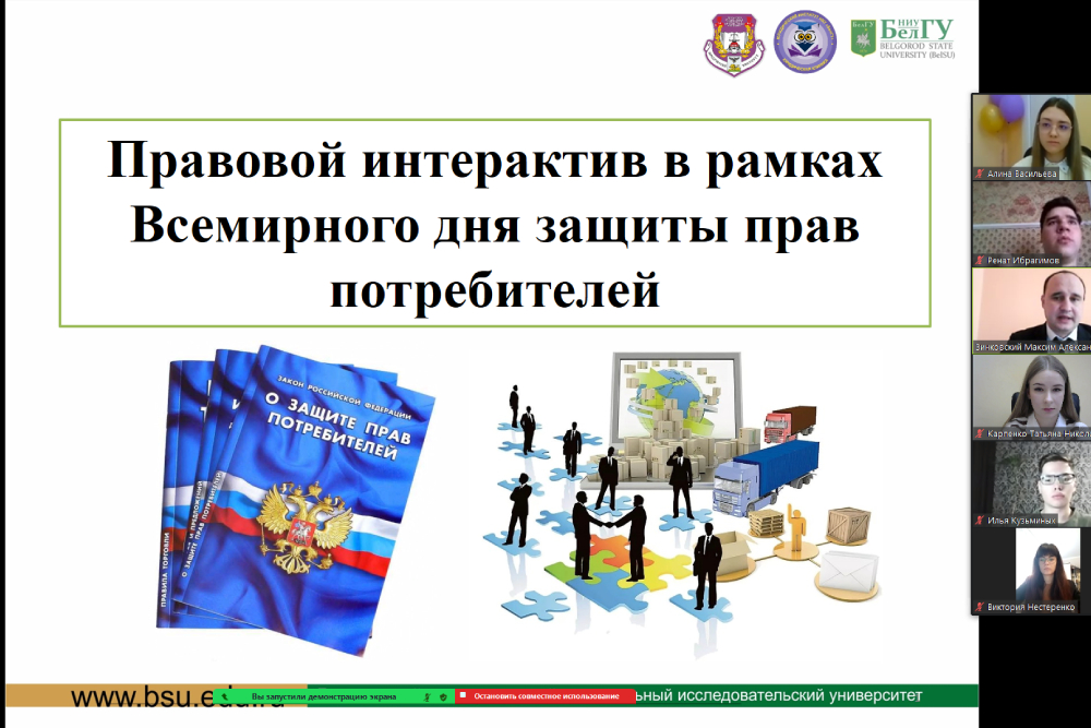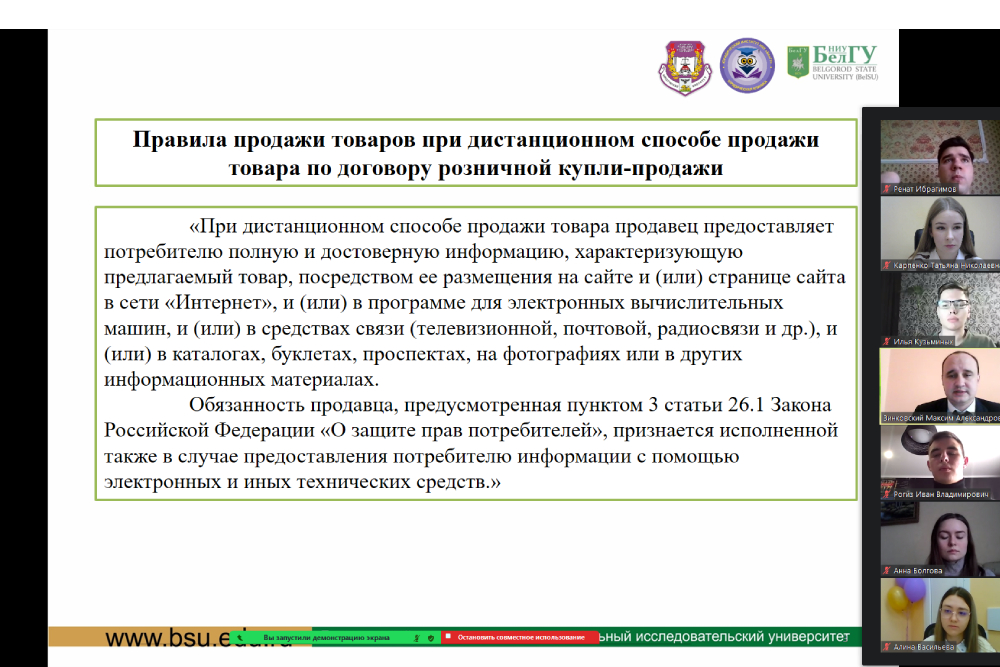 Обсуждению проблем в сфере защиты прав потребителей на территории Белгородской области была посвящена онлайн-встреча студентов юридического института НИУ «БелГУ» с заместителем начальника отдела защиты прав потребителей управления Роспотребнадзора по Белгородской области Ольгой Алексеевой.