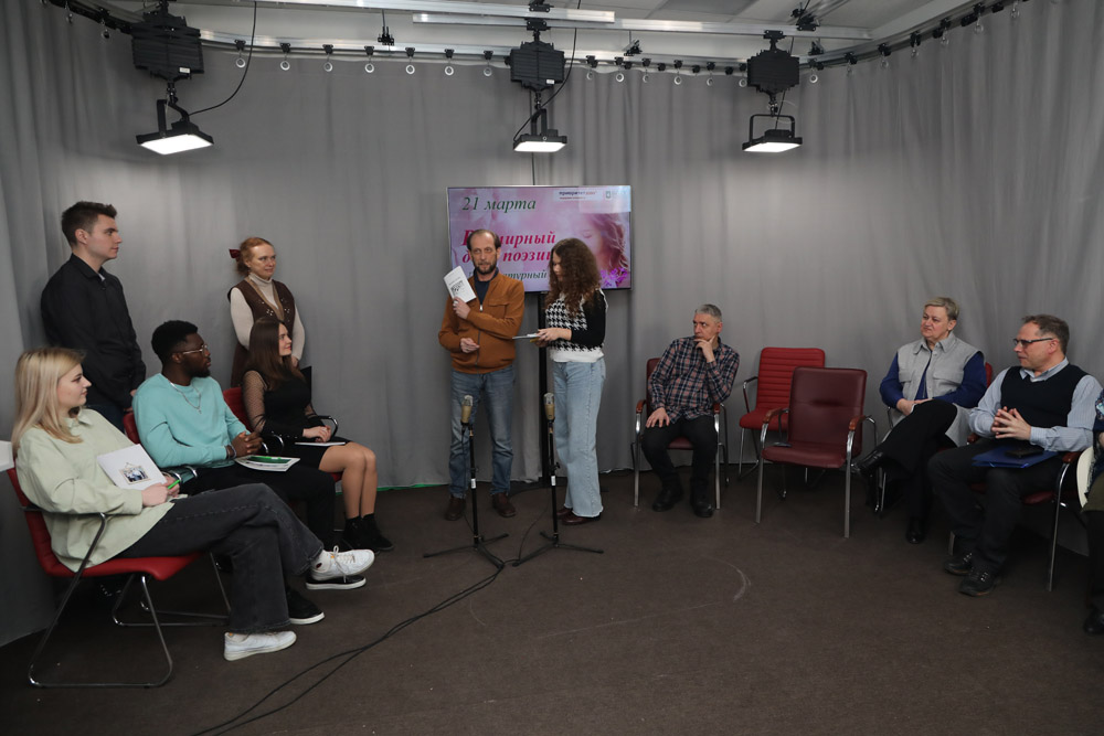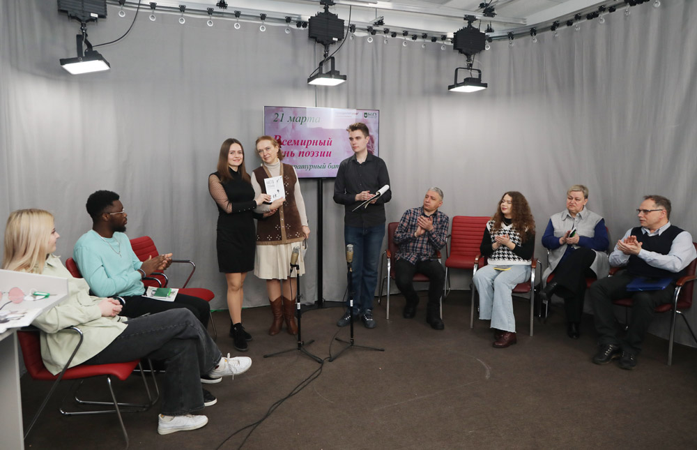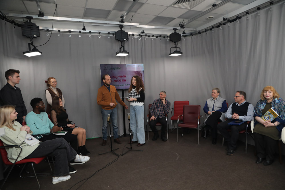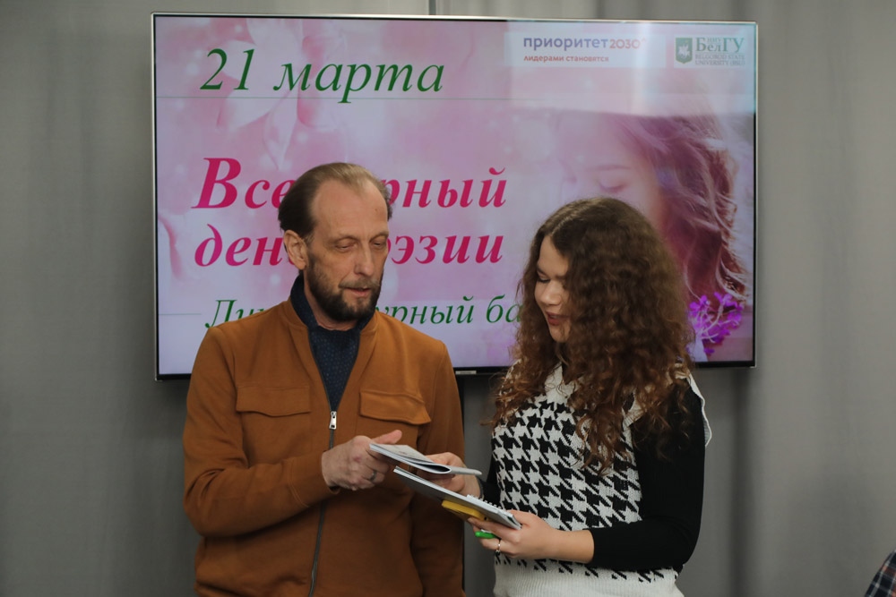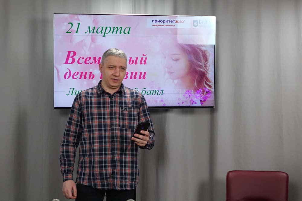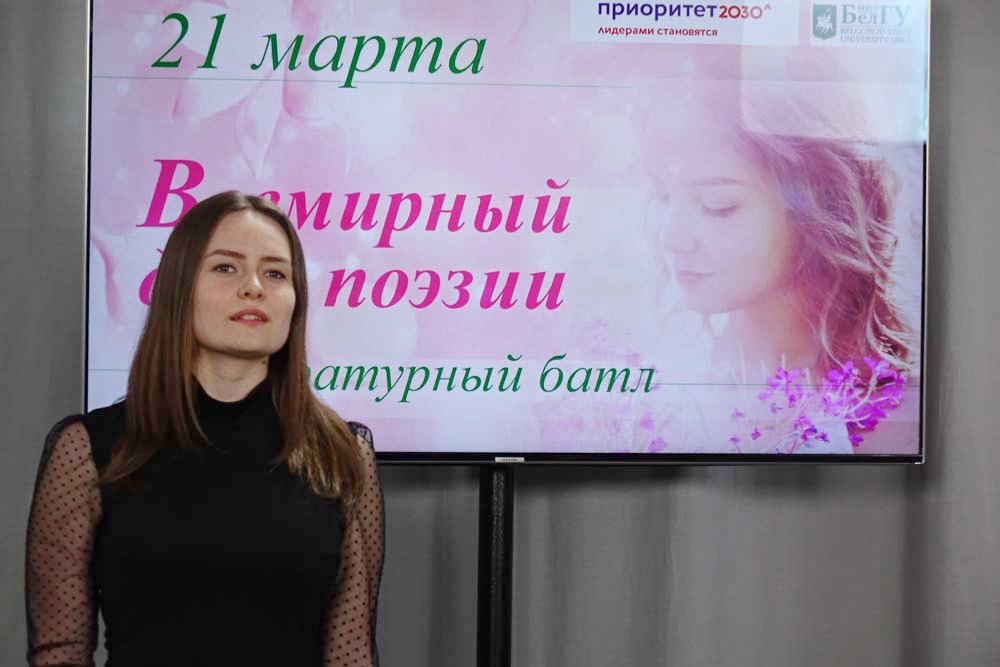 Межвузовский литературный батл, организованный в рамках проекта «Создание креативных пространств в молодёжной среде» программы «Приоритет-2030» и приуроченный к Году педагога и наставника в России, объединил в День поэзии пишущих и увлечённых поэзией молодых людей из разных вузов страны, а также известных белгородских поэтов, членов писательских союзов, преподавателей НИУ «БелГУ». Мероприятие прошло в смешанном формате: часть участников прислала видео с записанными стихами, которые продемонстрировали на большом экране в студии. Прямая трансляция была доступна для просмотра в университетской группе во ВКонтакте.