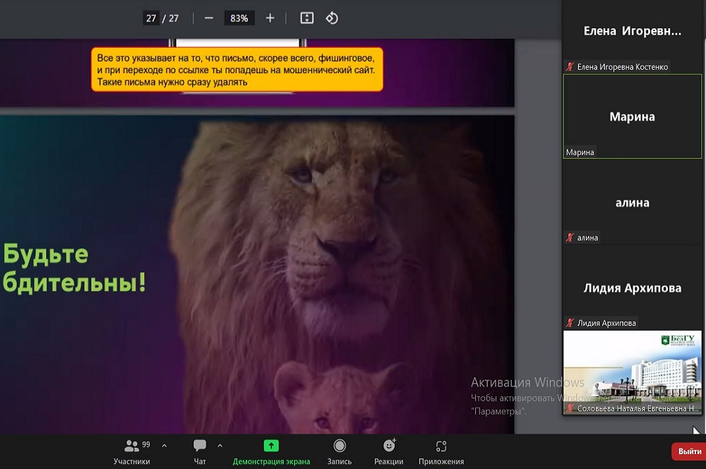 Подводя итоги встречи, Оксана Ваганова выразила надежду на то, что студенты НИУ «БелГУ» не попадут в сети мошенничества и смогут оказать помощь своим родным и близким.