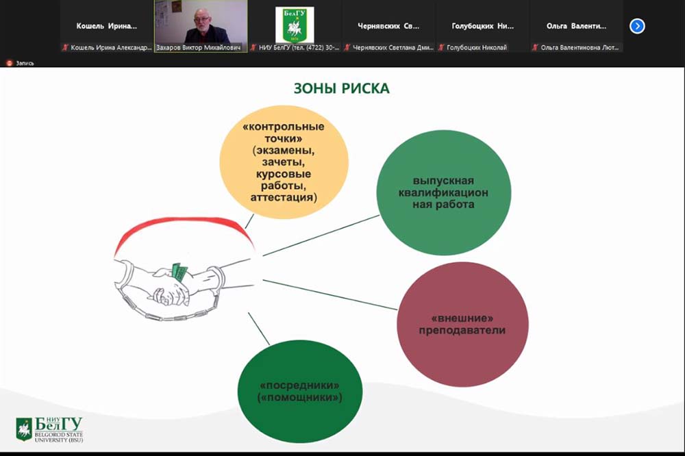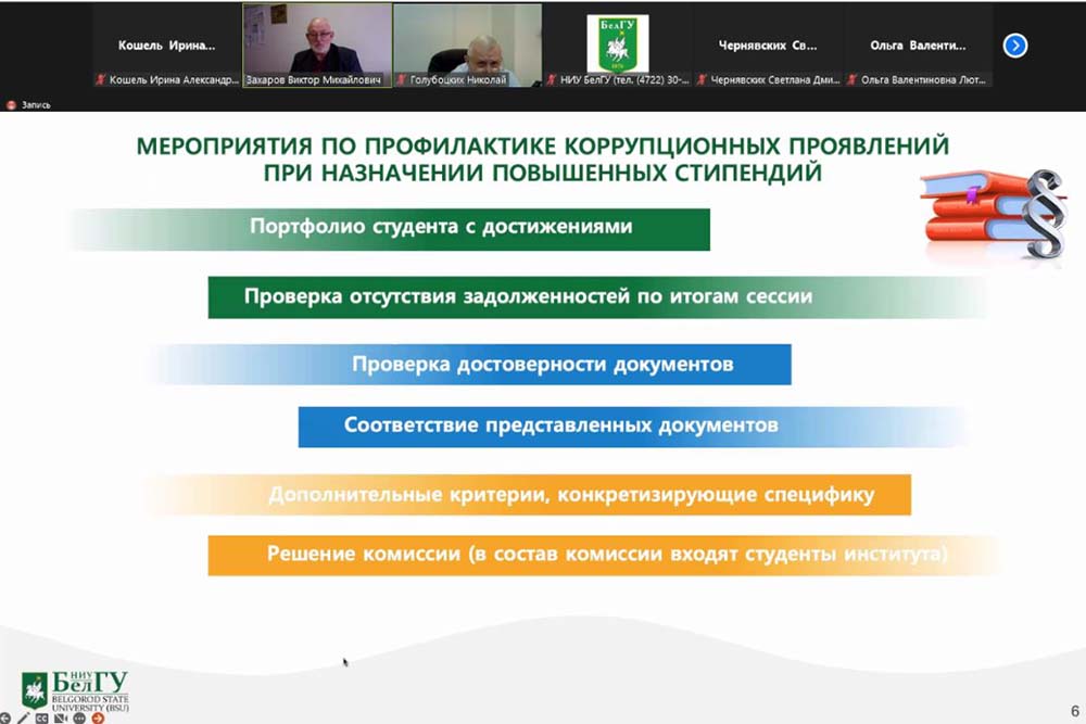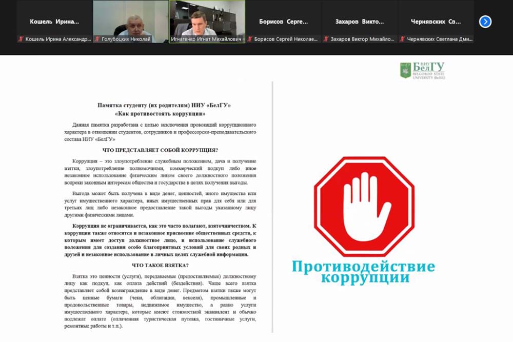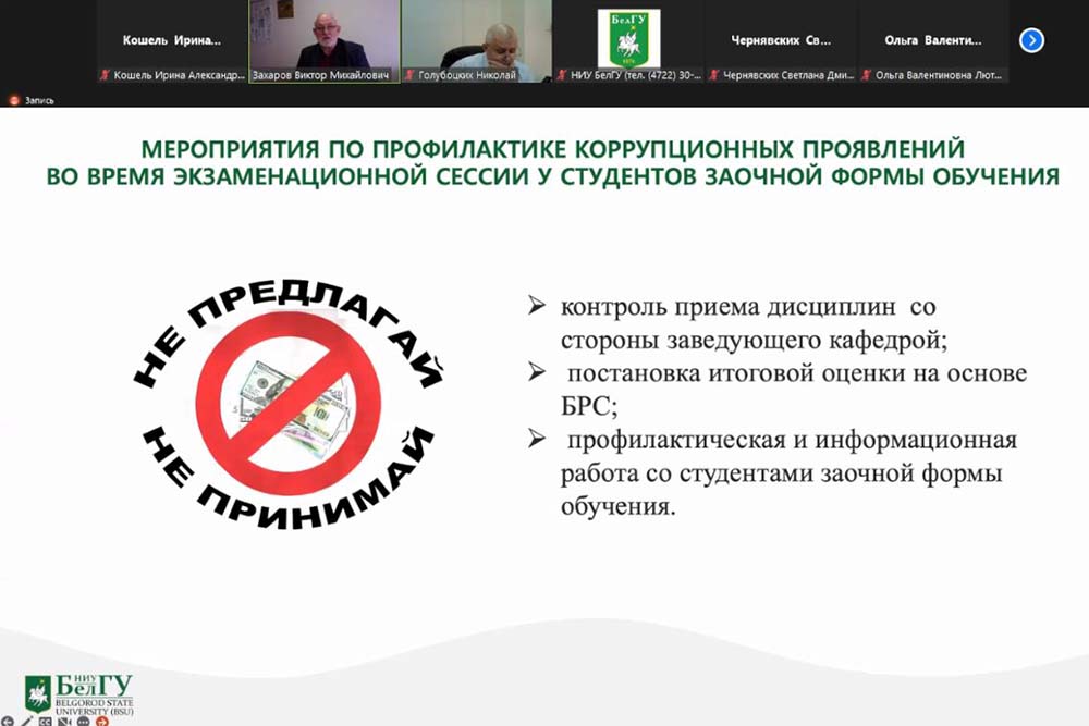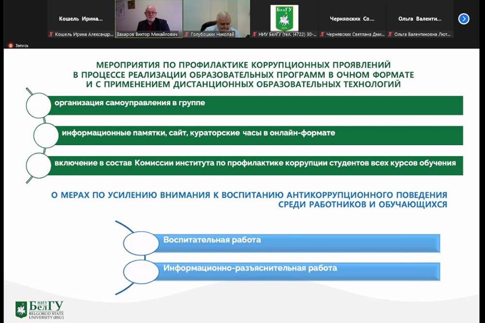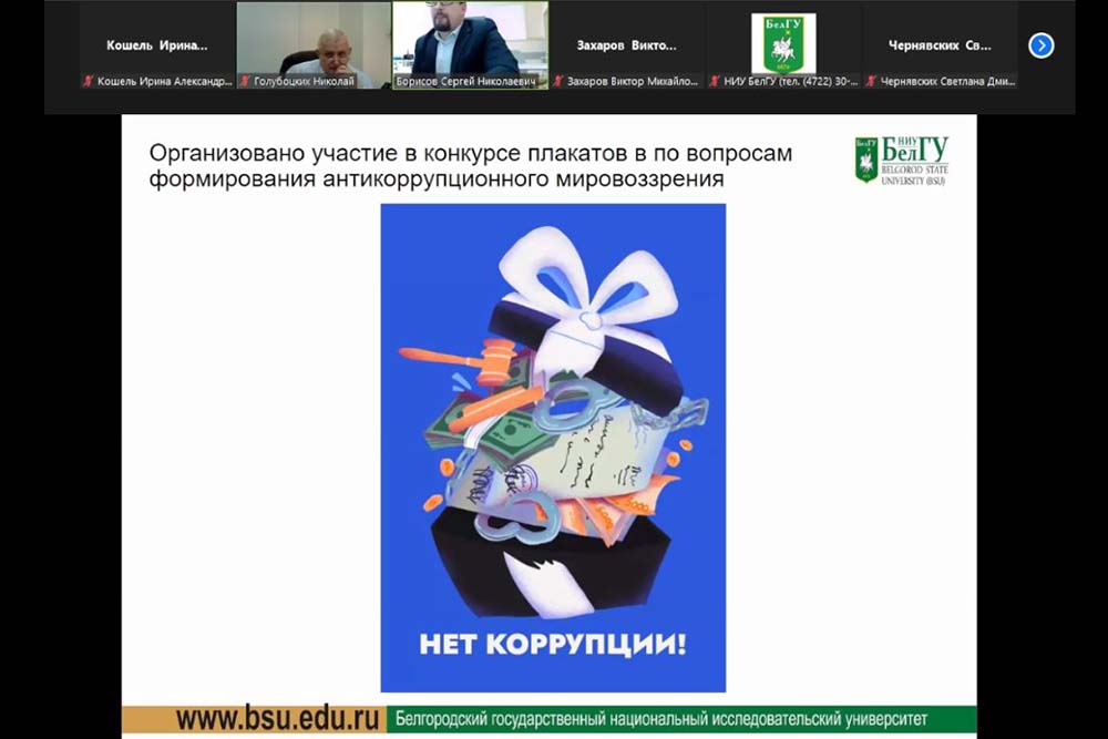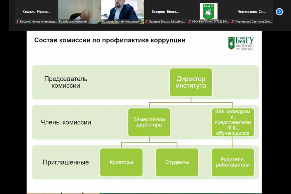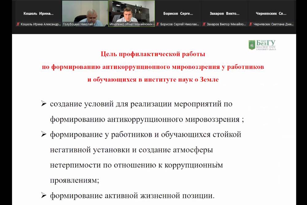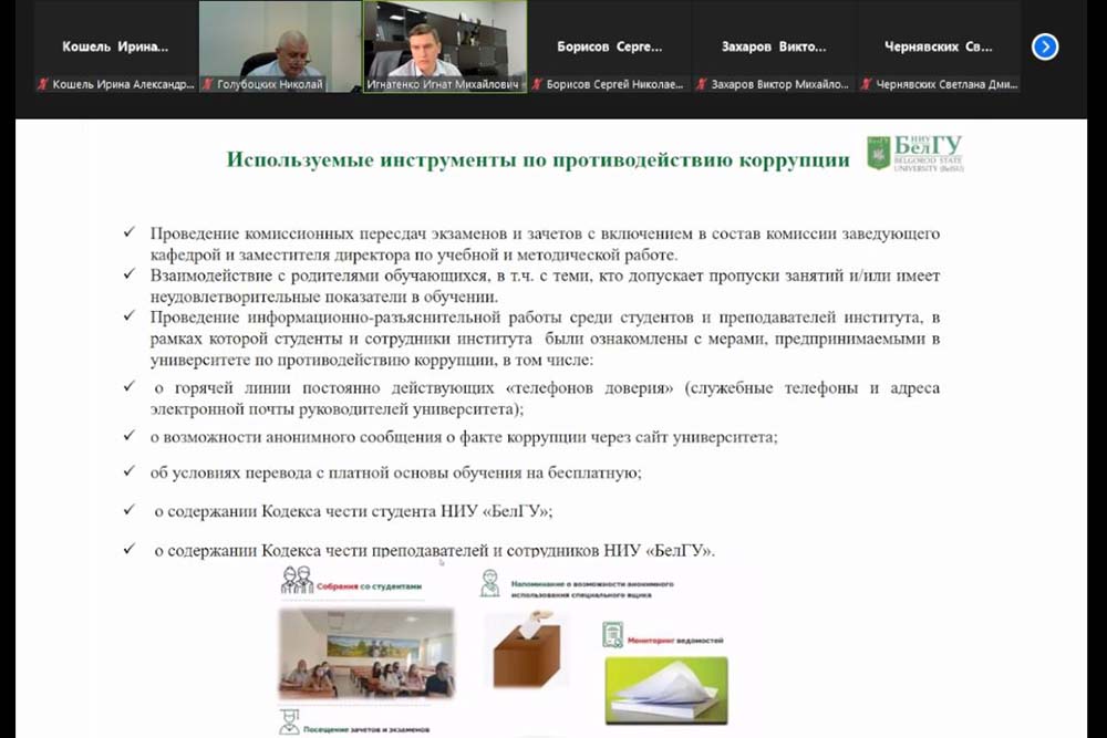На заседании Комиссии под руководством проректора по комплексной безопасности и развитию имущественного комплекса НИУ «БелГУ» Николая Голубоцких с докладами о профилактической антикоррупционной работе выступили директора трёх институтов: института экономики и управления Виктор Захаров, института общественных наук и массовых коммуникаций Сергей Борисов и института наук о Земле Игнат Игнатенко.