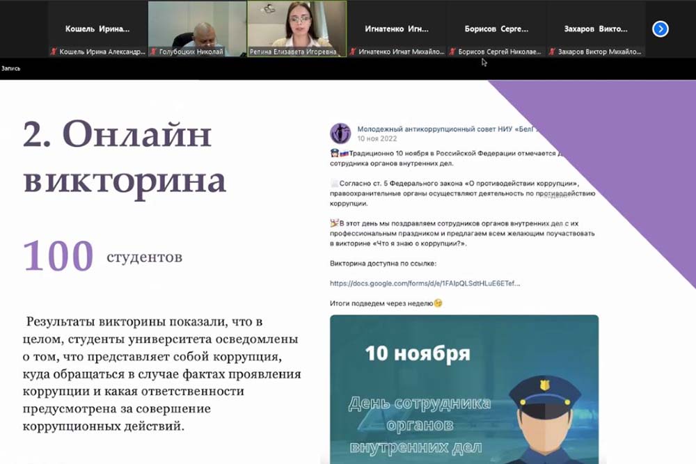 О работе комиссий институтов и факультетов по профилактике коррупции НИУ «БелГУ» в первом семестре 2022-2023 учебного года отчиталась секретарь Комиссии Елена Фивейская. Елена Сергеевна также отметила, что в настоящий момент в рамках системного мониторинга заканчивается социологический замер, посвящённый антикоррупционной политике университета. На следующем заседании Комиссии, которое состоится в конце мая 2023 года, руководитель Международного центра социологических исследований НИУ «БелГУ» – заведующая кафедрой социологии и организации работы с молодёжью, профессор Инна Шаповалова представит результаты.