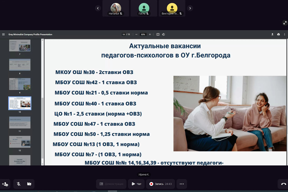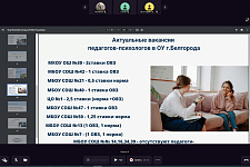 Ведущая мероприятия главный специалист профилактической и социально-педагогической работы МБУ «НМИЦ» Евгения Байдикова отметила, что в настоящий момент доступны как минимум 26 актуальных вакансий в дошкольных образовательных учреждениях и школах Белгорода.