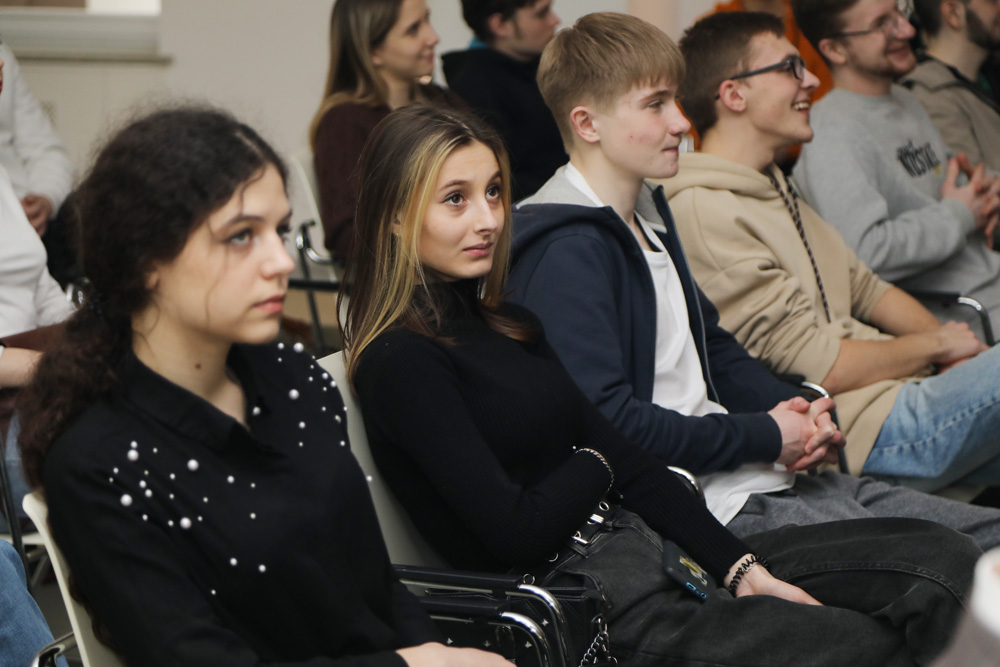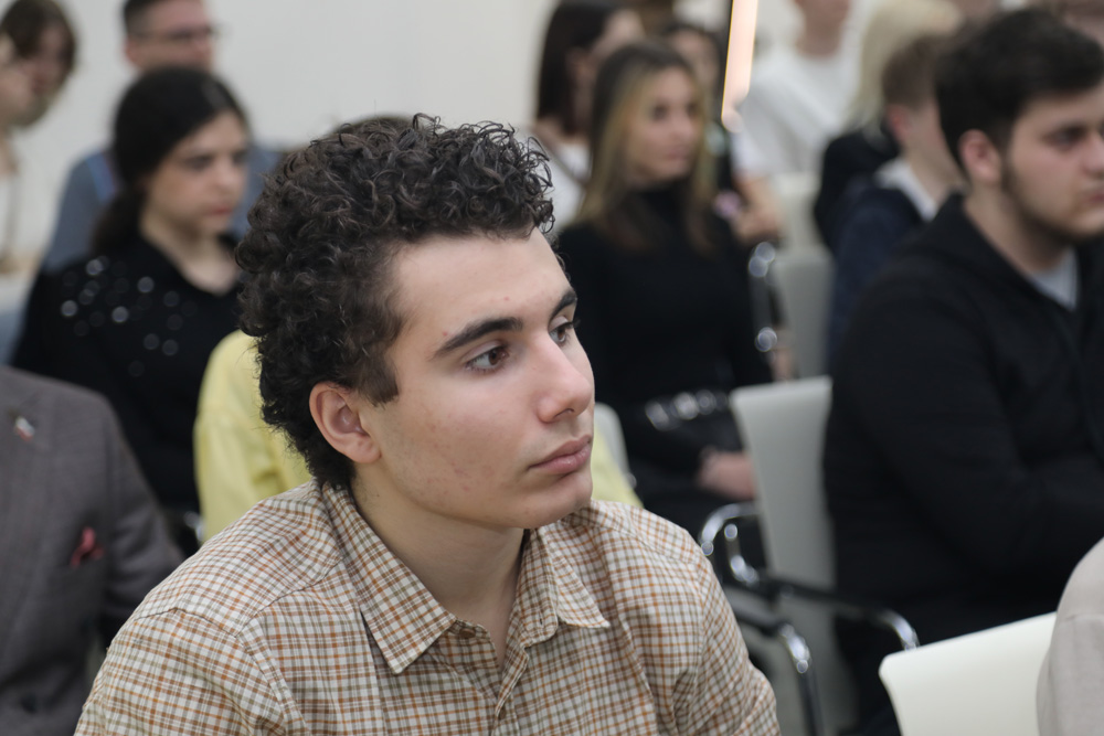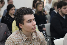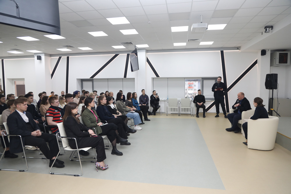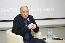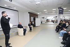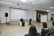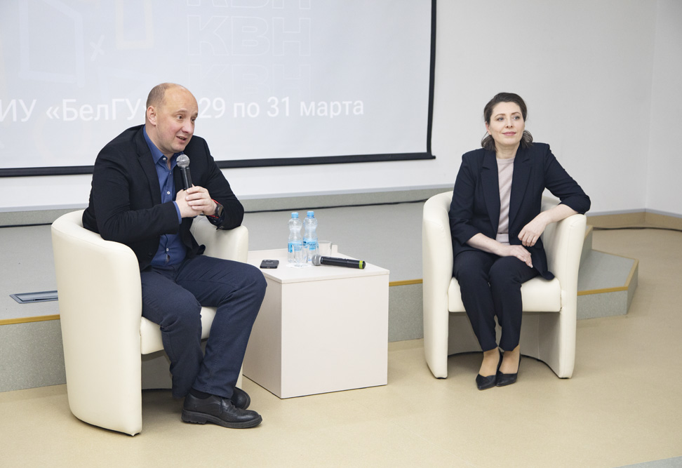 Модератор встречи, руководитель КВН-движения НИУ «БелГУ» Антон Колмыков представил гостям небольшой доклад о планах и перспективах развития КВН-движения в вузе, а также пригласил Константина Курганского в жюри Университетской лиги, которая состоится уже в мае.