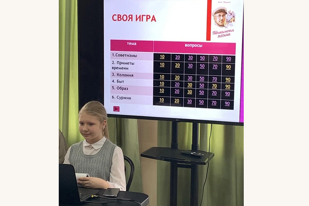 Интеллектуальную викторину «Своя игра» по мотивам «Педагогической поэмы» А.С. Макаренко В Нобелевской гостиной НИУ «БелГУ» провела участница «Проектной школы юного филолога» – ученица 6 класса гимназии № 22 Анна Сычёва (руководитель – преподаватель БЮИ Ирина Сычёва).