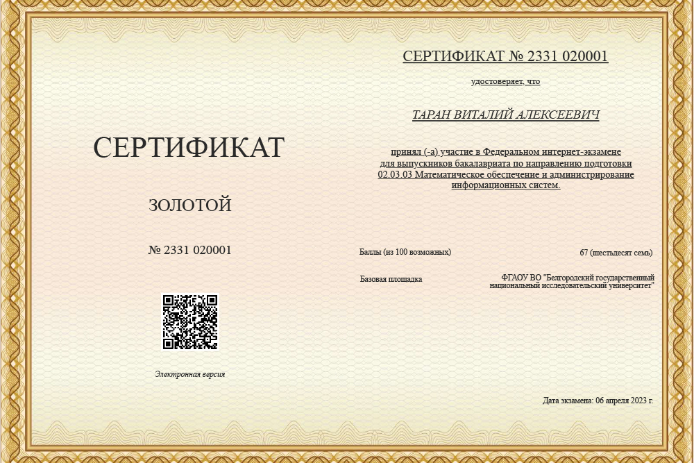 По результатам экзамена сертификаты участников получили Илья Габелков, Даниил Милютин, Эльмар Байрамов и Станислав Посашков. Обладателями бронзовых сертификатов стали Никита Чуйков и Татьяна Тверянкина, серебряных сертификатов удостоились Мария Ходячих, Артём Борисов и Антон Дахин. Самым эрудированным оказался Виталий Таран, который завоевал золотой сертификат и вошёл в число лучших студентов России.