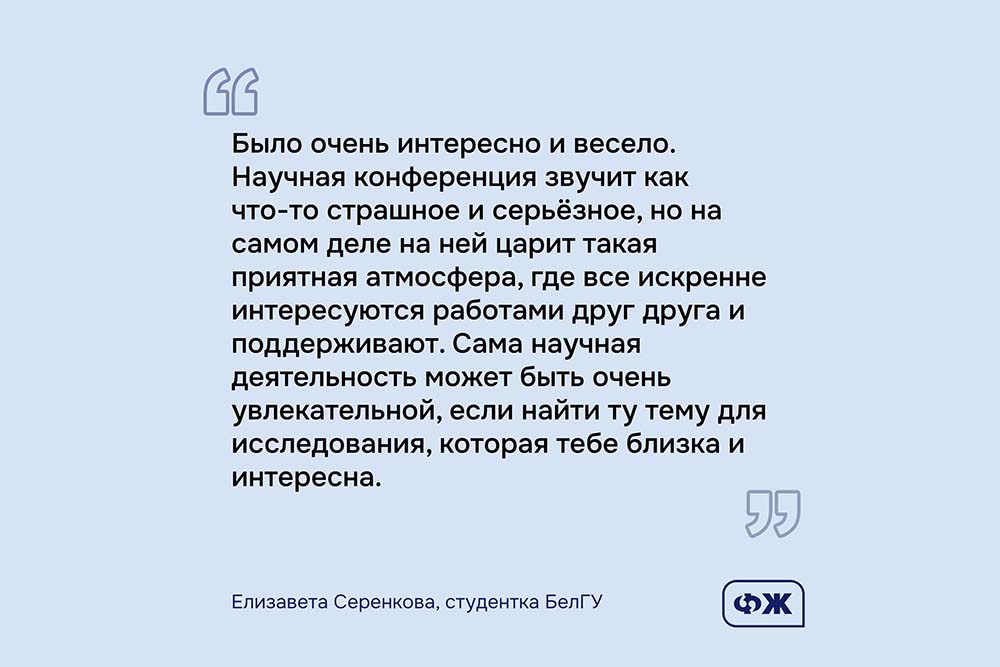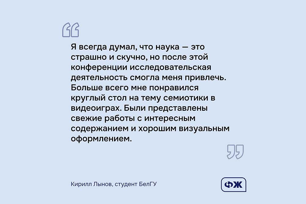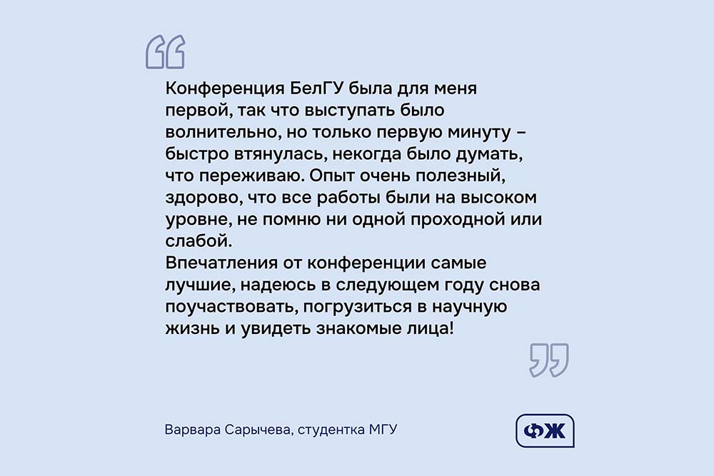– Итоги научных дискуссий и масштаб мероприятия убедительно подтвердили актуальность и перспективность научных исследований и разработок, которые проводят студенты, магистранты и аспиранты НИУ «БелГУ». В результате конференции участники смогли определить новые межвузовские контакты, обсудили новые векторы совместных исследований и сетевое сотрудничество в области студенческой науки, – прокомментировал заведующий кафедрой коммуникативистики, рекламы и связей с общественностью НИУ «БелГУ», профессор Евгений Кожемякин.