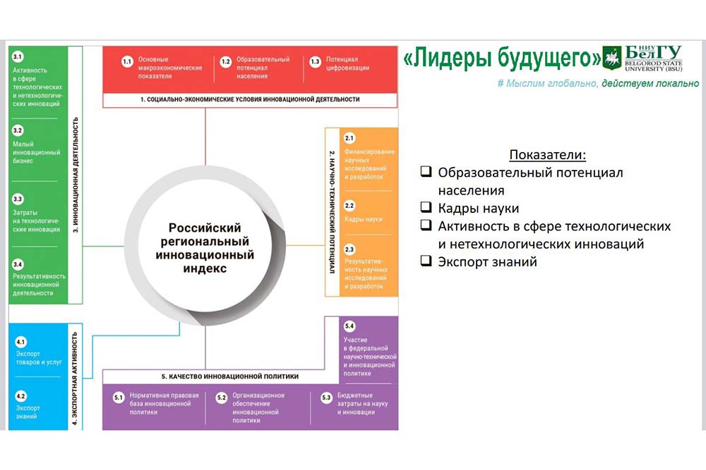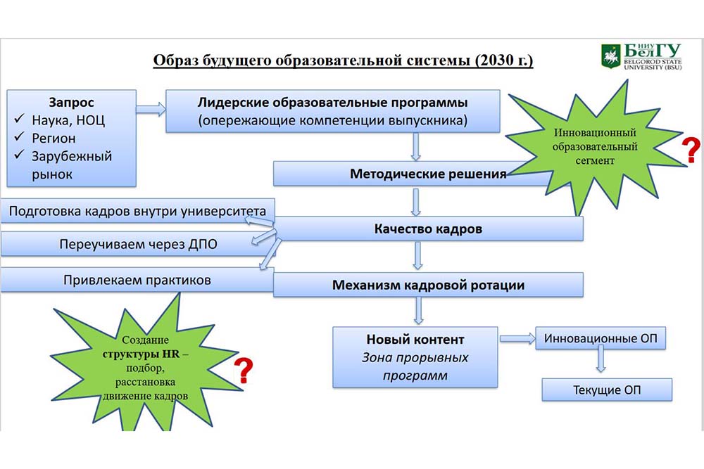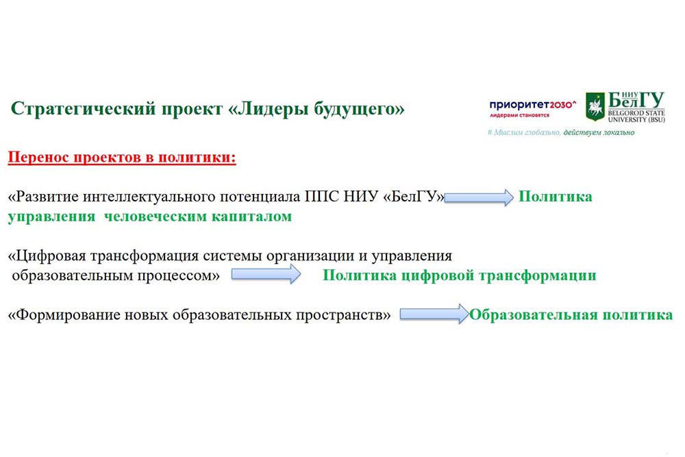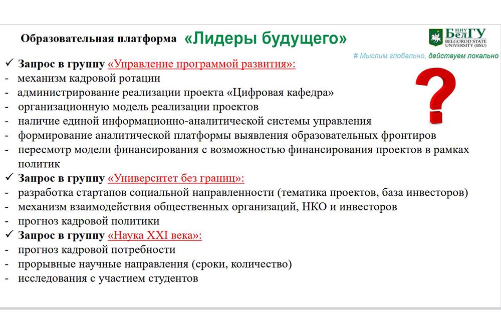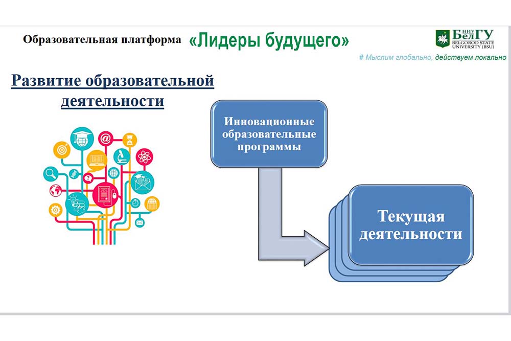 Команда группы «Лидеры будущего» (и. о. директора центра междисциплинарного обучения и сетевых образовательных программ Валентина Шевченко, заведующая кафедрой информатики, естественнонаучных дисциплин и методик преподавания Ольга Сатлер и доцент кафедры педагогики Елена Кролевецкая) под руководством директора по развитию образования РАНХиГС Ирины Апыхтиной представила новую концепцию развития образовательной деятельности вуза. В НИУ «БелГУ» предлагают создать инновационный образовательный сегмент, ориентированный на подготовку и переподготовку кадров, обладающих опережающими компетенциями, в том числе и цифровыми. Приоритетными в формировании новой образовательной системы станут проекты по выявлению и привлечению в университет талантливой молодёжи (в т. ч. профильные классы), закреплению в регионе и целевому трудоустройству выпускников, развитию молодёжного предпринимательства.
