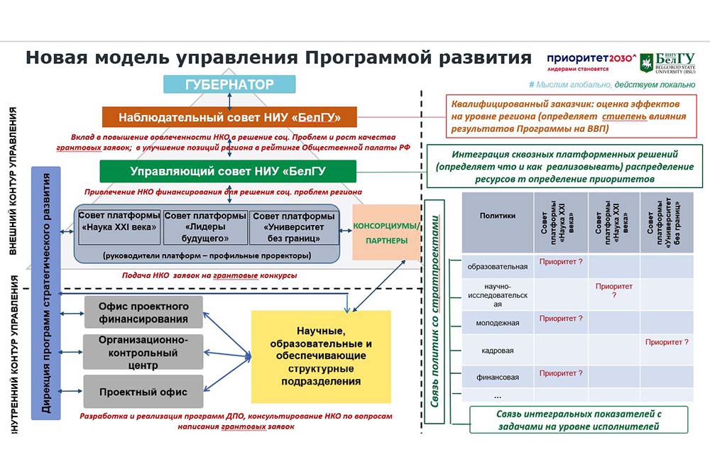 Изменения, озвученные заместителем директора департамента научной коммуникации и издательской деятельности НИУ «БелГУ» Инной Каськовой, коснулись перераспределения ролей в структуре системы управления, связи политик НИУ «БелГУ» (образовательной, научно-исследовательской, молодёжной, финансовой, информационной и др.) со стратегическими проектами, процессов, инструментов и т.д.