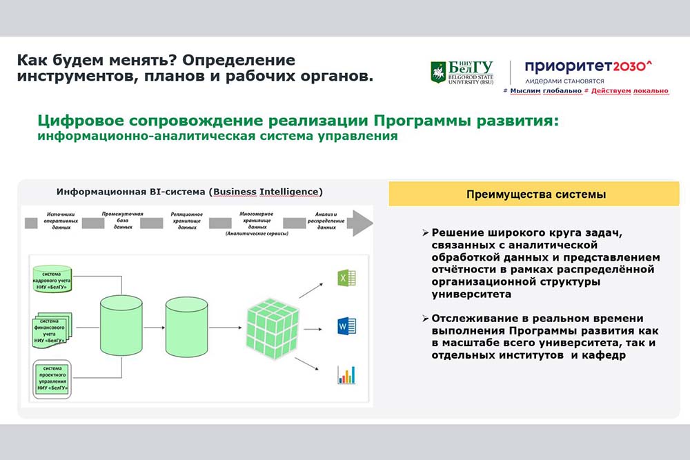 Акцент был сделан на цифровом сопровождении реализации Программы развития за счёт внедрения информационно-аналитической системы управления. Это позволит решить широкий круг задач, связанных с аналитической обработкой данных, представлением отчётности. Также система позволит отслеживать в реальном времени показатели выполнения Программы развития как в университете в целом, так и на уровне отдельных институтов и кафедр.