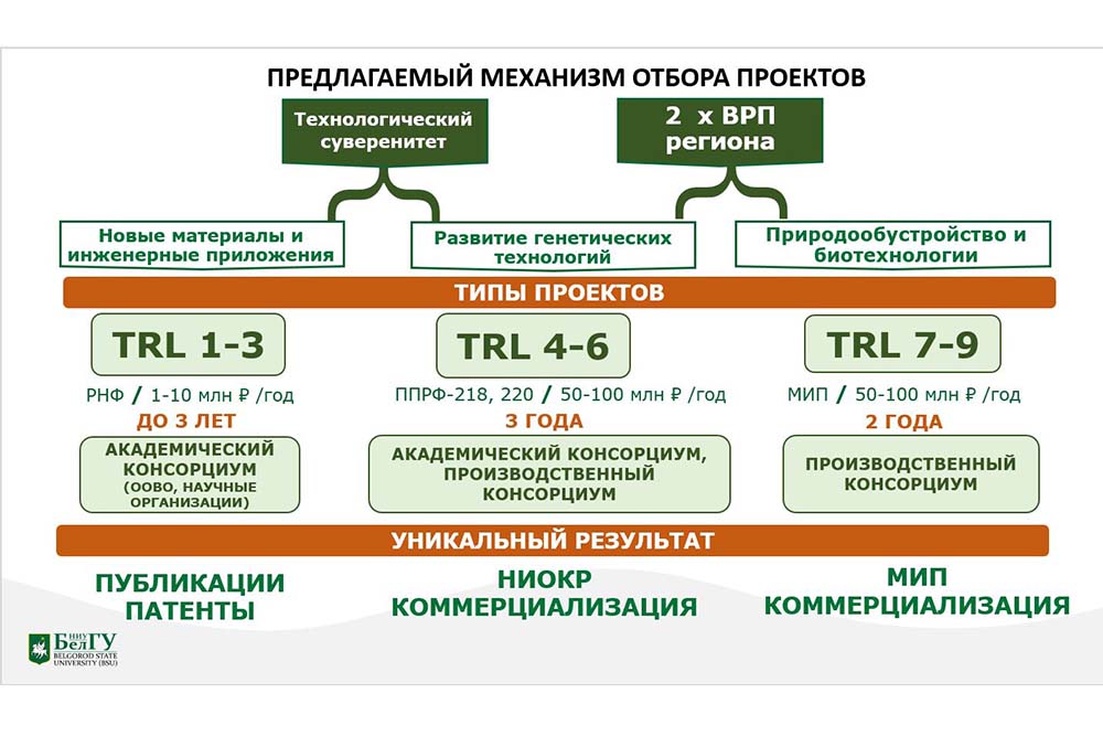 Руководитель Регионального центра интеллектуальной собственности НИУ «БелГУ» Дмитрий Ушаков и директор Объединённого центра генетических технологий Алексей Дейкин обозначили выявленные вызовы и зоны развития научных направлений и представили новый механизм отбора и градации проектов в зависимости от уровня технологической готовности и потенциальных источников финансирования.