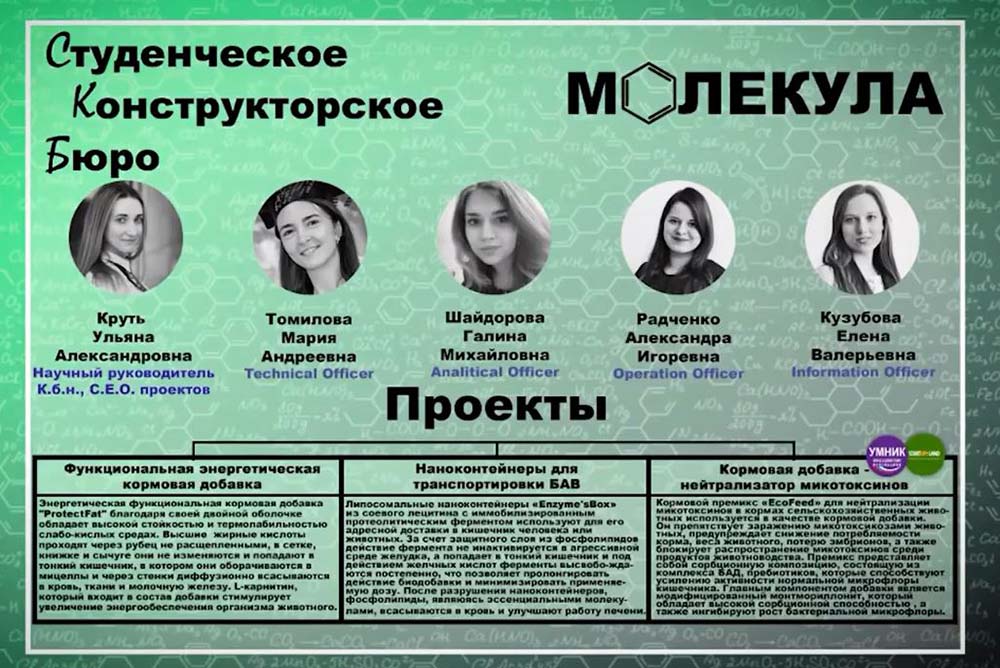 В номинации «Удачный манёвр» с видеороликом «Кормовой премикс EcoFeed» победила команда института фармации, химии и биологии и медицинского института в составе Ульяны Круть, Елены Кузубовой, Александры Радченко и Галины Шайдоровой.