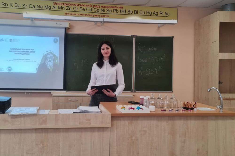 Старший преподаватель кафедры общей химии Ярослава Саласина прочла для обучающихся МОУ «Северная СОШ №2» лекцию на тему «Натуральные красители или как сделать нашу жизнь более здоровой и яркой». Она рассказала ребятам об основных источниках сырья для производства натуральных красителей, их пользе и областях применения. Живой интерес вызвали у ребят образцы косметических средств, разработанных и изготовленных с использованием натуральных красителей, которые продемонстрировала Ярослава Юрьевна.