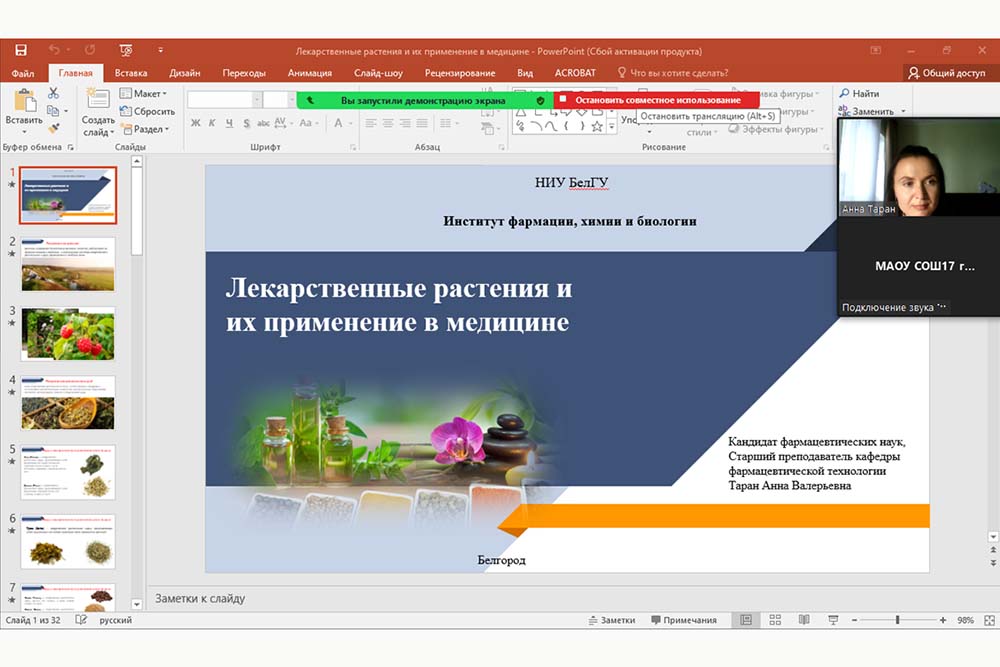 О лекарственных растениях и их применении в медицине рассказала старший преподаватель кафедры фармацевтической технологии Анна Таран. Слушателями лекции стали учащиеся МАОУ СОШ №17 в Губкине. Анна Валерьевна познакомила присутствующих с ассортиментом и особенностями производства препаратов на основе лекарственных растений.