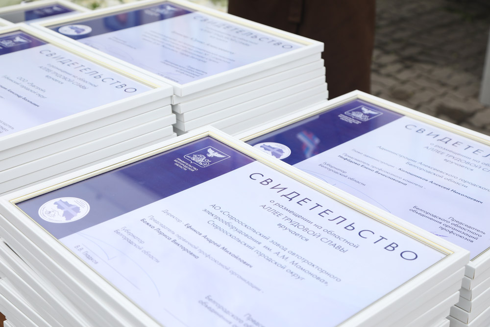 Коллектив НИУ «БелГУ» стал победителем в номинации «Общественная организация Белгородской области». Свидетельство о занесении на Аллею Трудовой Славы из рук губернатора региона Вячеслава Гладкова, председателя областной Думы Юрия Клепикова и председателя Белгородского областного объединения организаций профсоюзов Николая Шаталова получили и.о. ректора НИУ «БелГУ» Евгения Карловская и председатель профсоюзной организации вуза Валерий Тимофеев.