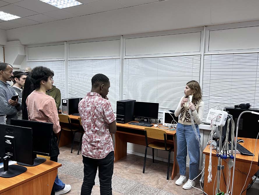 В лаборатории биотехнических систем слушателям подготовительного факультета продемонстрировали стенды контроля параметров жизнедеятельности человека. Особенный интерес вызвал стенд мониторинга активности головного мозга. Один из слушателей поучаствовал в специальном тренинге по оценке и коррекции психоэмоционального состояния в ходе симуляции полёта на космическом корабле сквозь пояс астероидов.