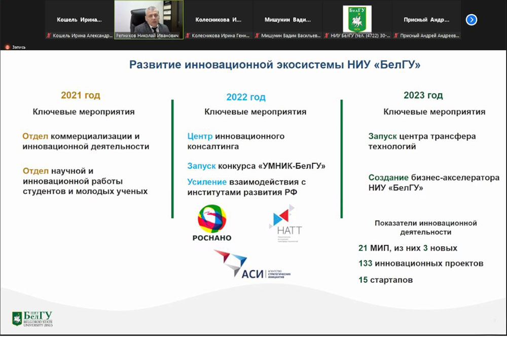 И.о. проректора по научной и инновационной деятельности НИУ «БелГУ», руководитель платформы «Наука XXI» века Николай Репников представил к рассмотрению новый формат инновационной инфраструктуры вуза, нацеленной на коммерциализацию научных разработок учёных и студентов. Для этого в университете в рамках программы «Приоритет-2030» планируют создать Центр трансфера технологий и бизнес-акселератор.